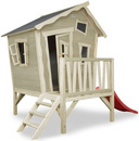 Drewniany domek ogrodowy z werandą i zjeżdżalnią do zabawy Crooky 300 szaro-beżowy