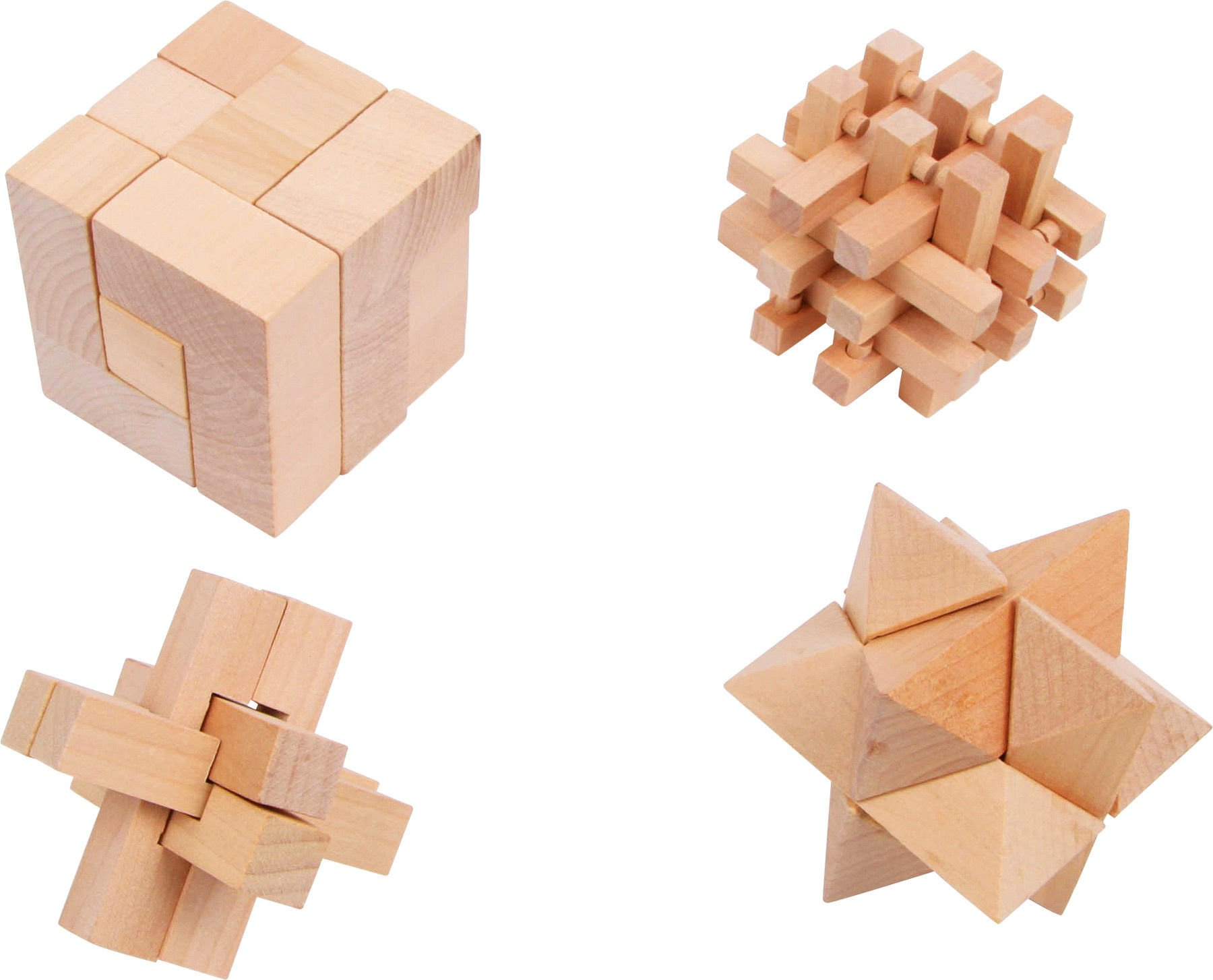 - Zestaw 4 drewnianych łamigłówek ćwiczących logiczne i przestrzenne myślenie. Dla graczy w wieku od 5 lat. Small Foot 2934.