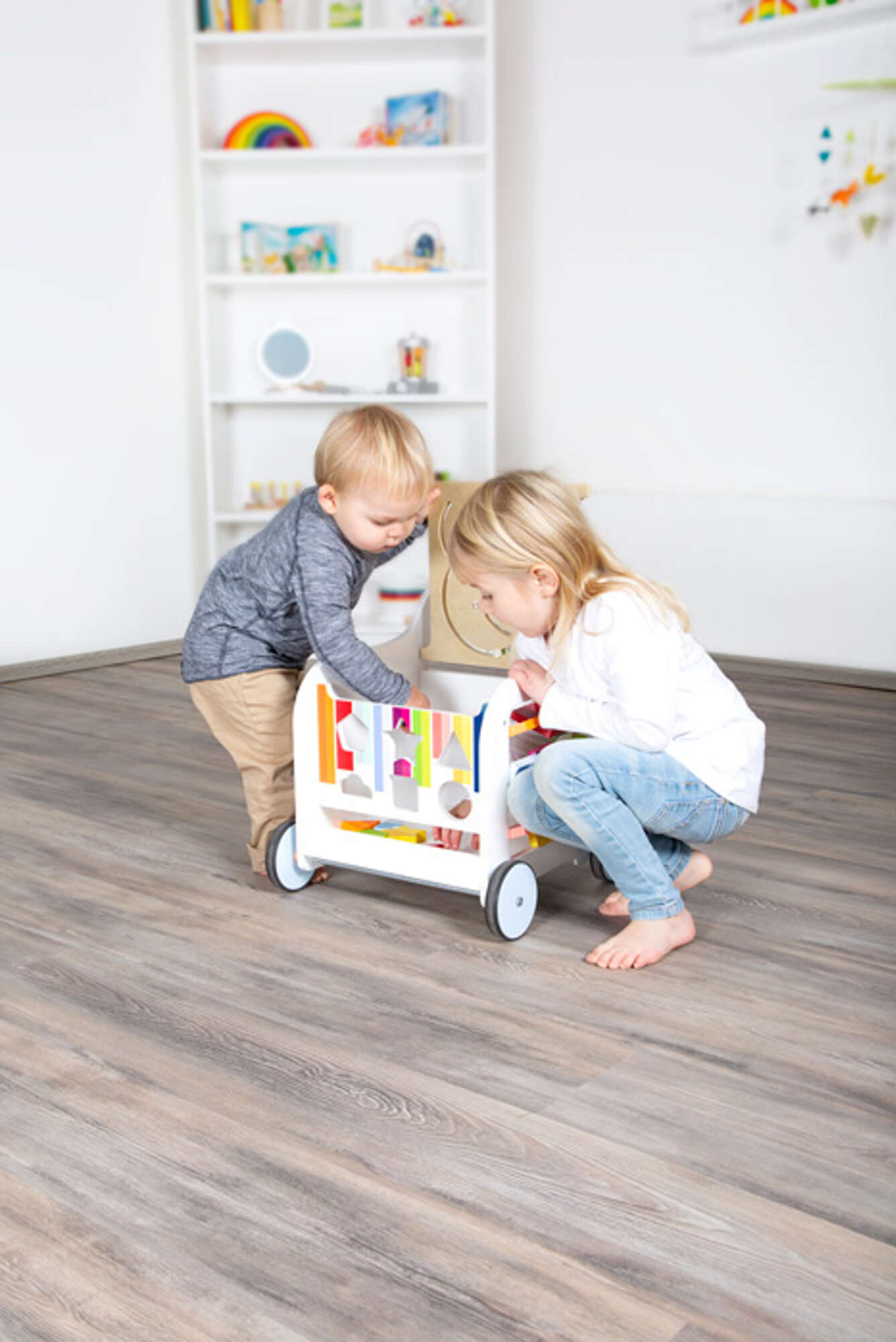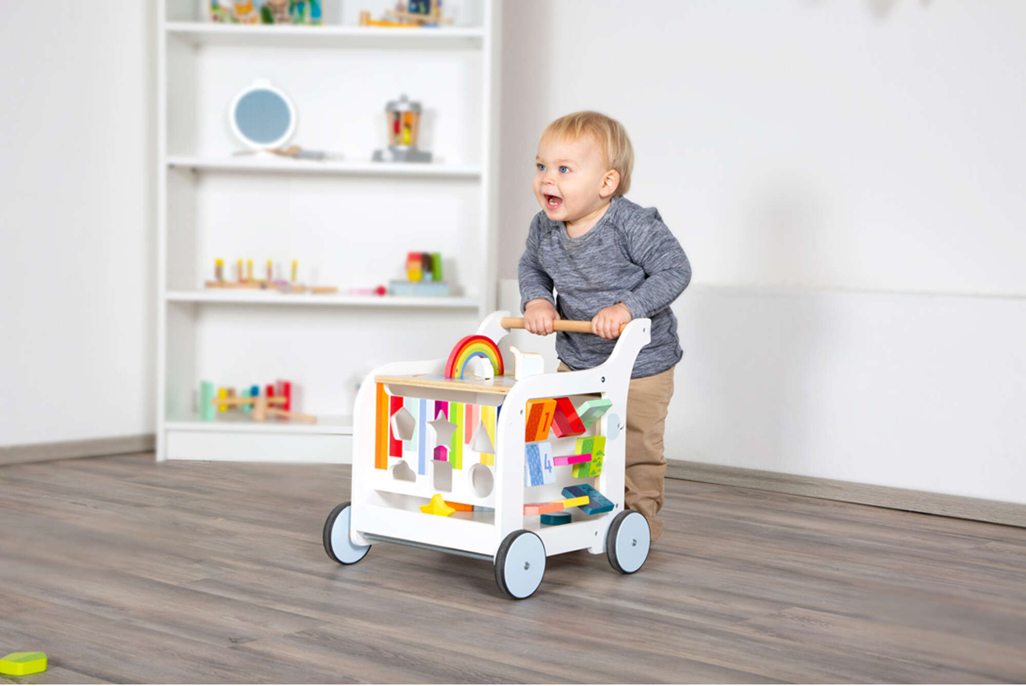 Chodzik towarzyszy dziecku w stawianiu pierwszych kroków. Został tak zaprojektowany, aby dziecko stabilnie i w zupełnie bezpieczny sposób mogło się poruszać, trzymając się za drewnianą rączkę. Chodzik zapewnia mnóstwo zabawy, a przede wszystkim uczy logicznego myślenia, pobudza wyobraźnię dziecka, rozwija sprawność manualną dziecka i koordynację ruchową oraz takie umiejętności, jak rozpoznawanie kształtów i kolorów czy dopasowywanie elementów do właściwych miejsc.