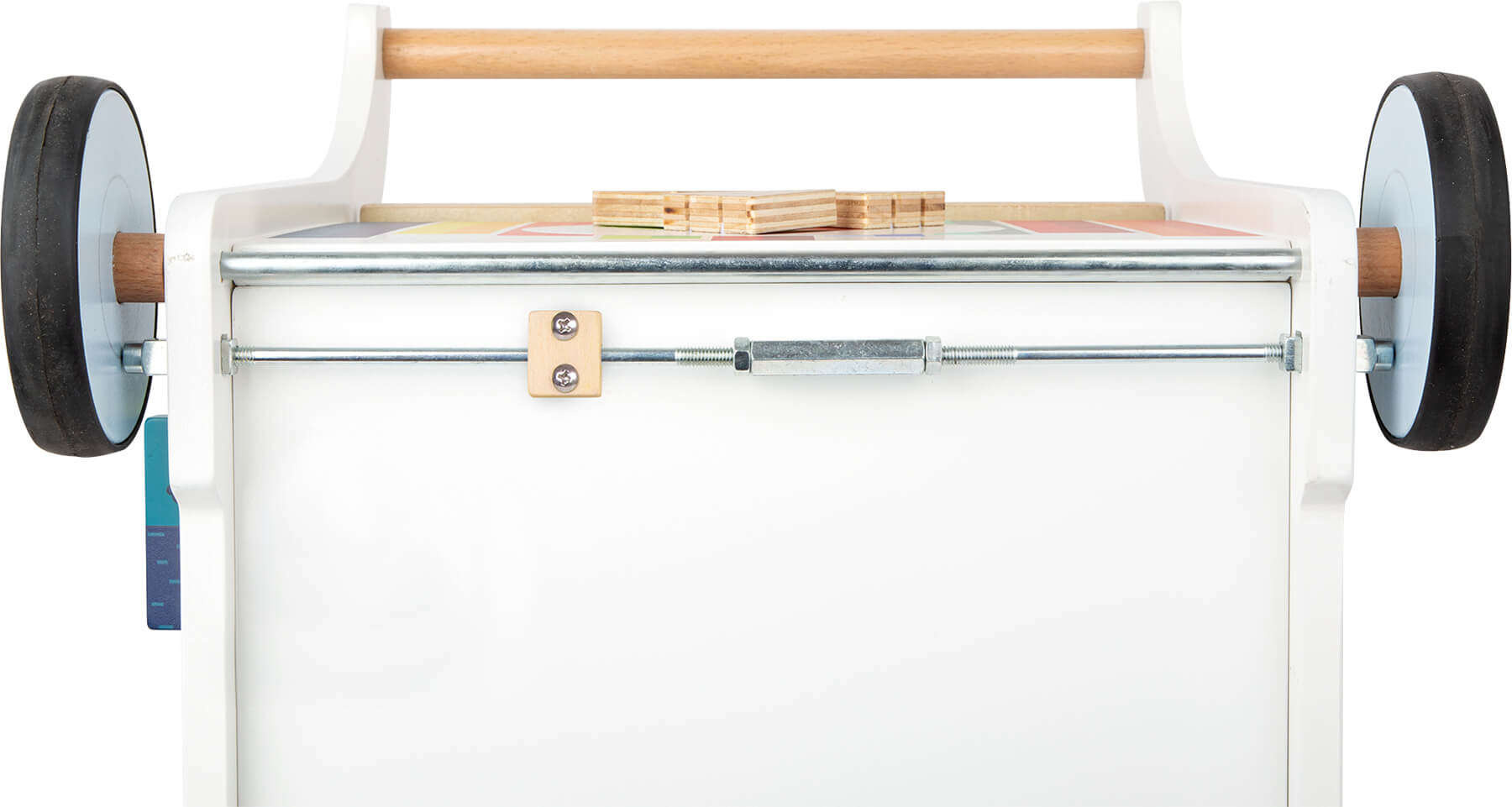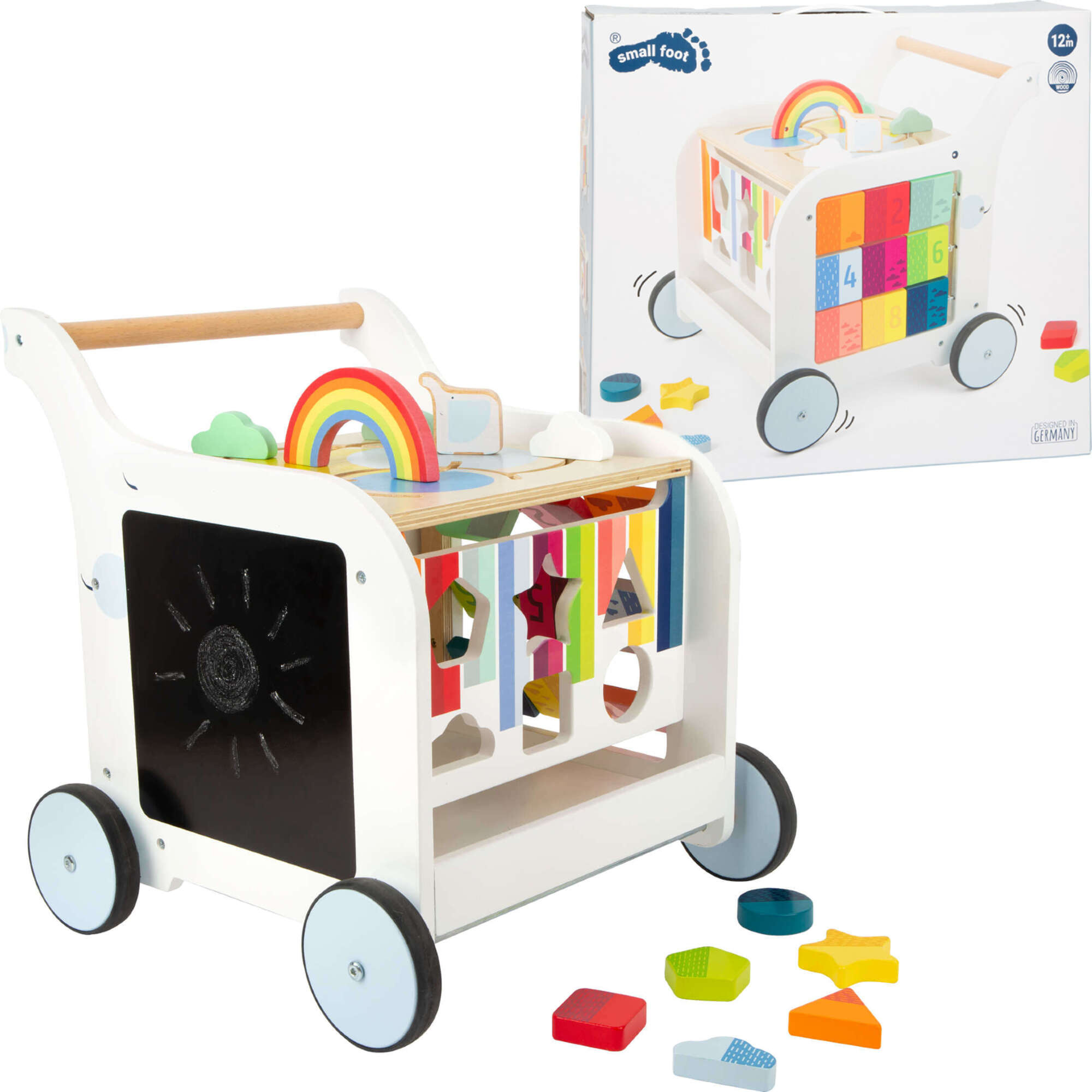 - Drewniany edukacyjny chodzik pchacz, od marki Small Foot. Został wykonany z ekologicznego drewna. Wyposażony jest w różne zabawy dla dziecka: labirynt ze słoniem, sorter z kształtami, puzzle, układankę oraz tablicę do rysowania kredą.