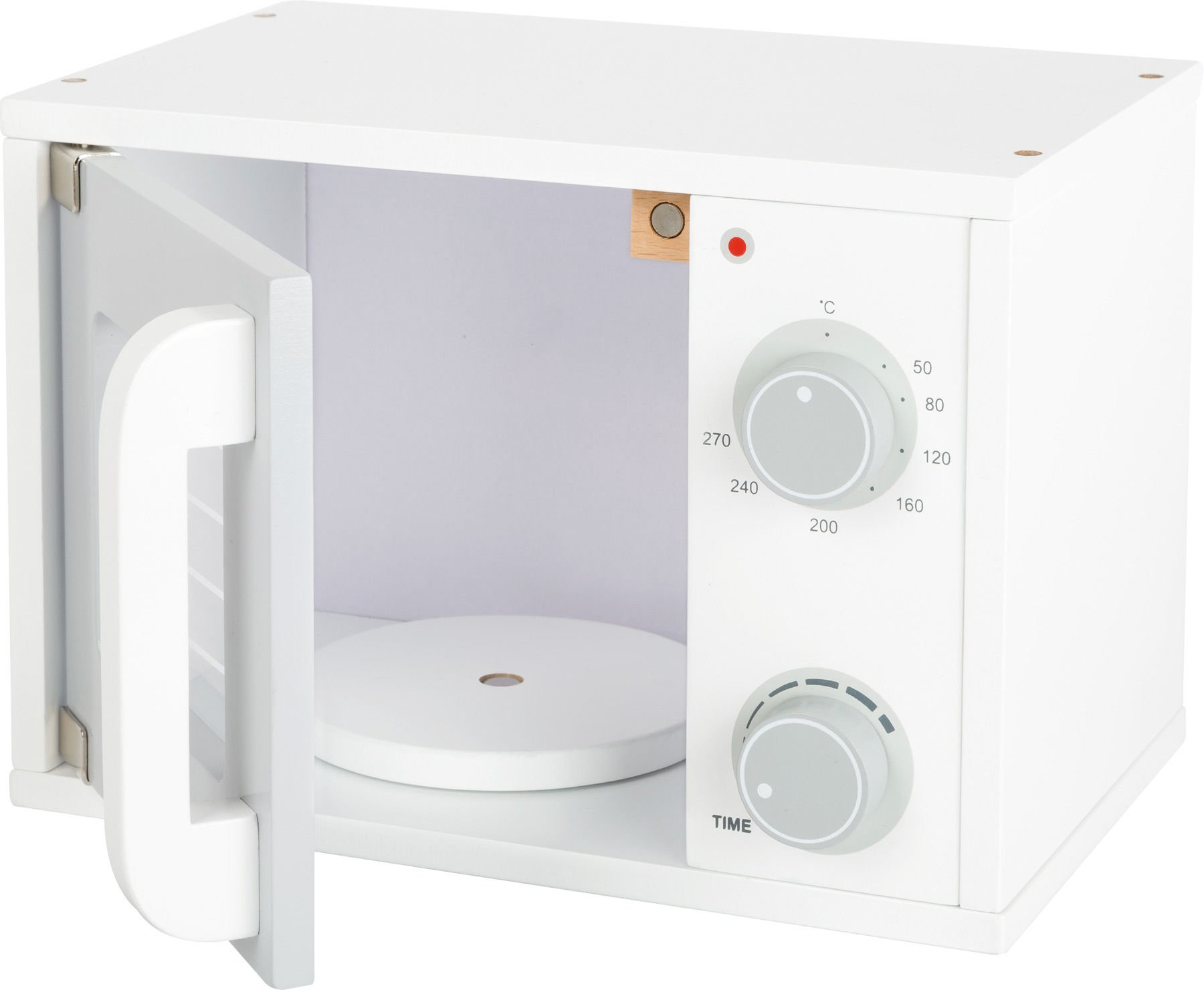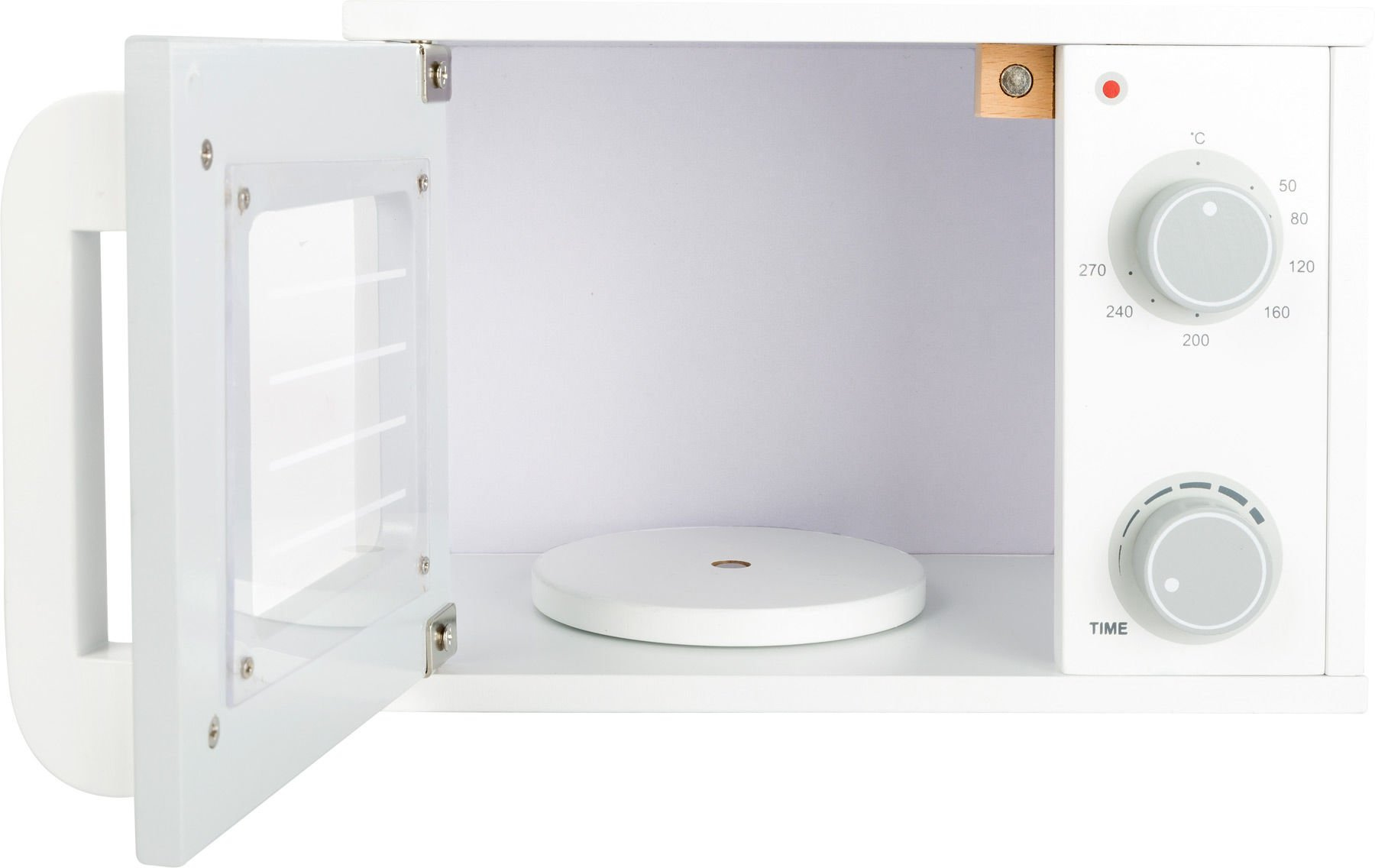 Ta dziecięca, stworzona w rozmiarze idealnym do małych rączek, mikrofalówka szybko stanie się ulubioną zabawką. Drzwiczki na magnes z łatwością pozwalają się otwierać i zamykać, a dwa pokrętła wydające charakterystyczne klikanie nadają całości realizmu. Talerz we wnętrzu mikrofalówki jest obracany. Teraz już nic nie stoi na przeszkodzie, by "podgrzać" swoje ulubione dania.