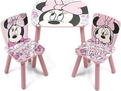 - Drewniany zestaw stolik i dwa krzesełka z motywem Myszki Minnie. Dla dzieci od 3. roku życia.