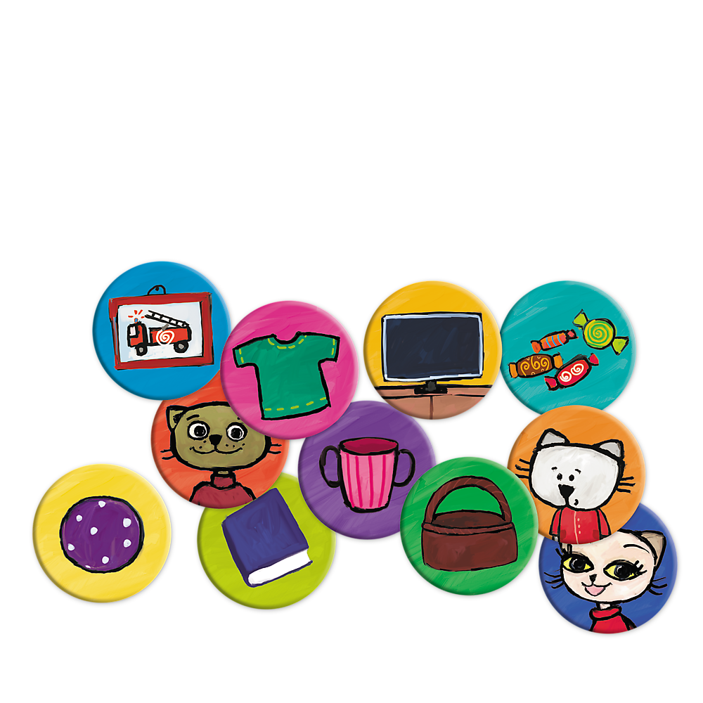 Obrazki zawierają m.in podobizny bohaterów bajki oraz przedmioty takie jak kubek, koszulka, cukierki, książka.