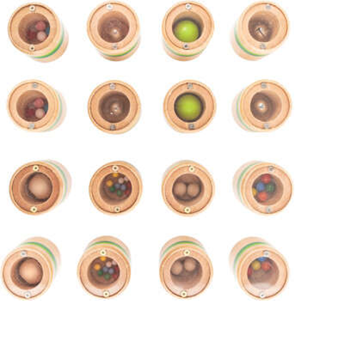 Osiem par pojemniczków zostało wypełnionych zawartością, z których każda generuje inny dźwięk - kulki o różnych rozmiarach.