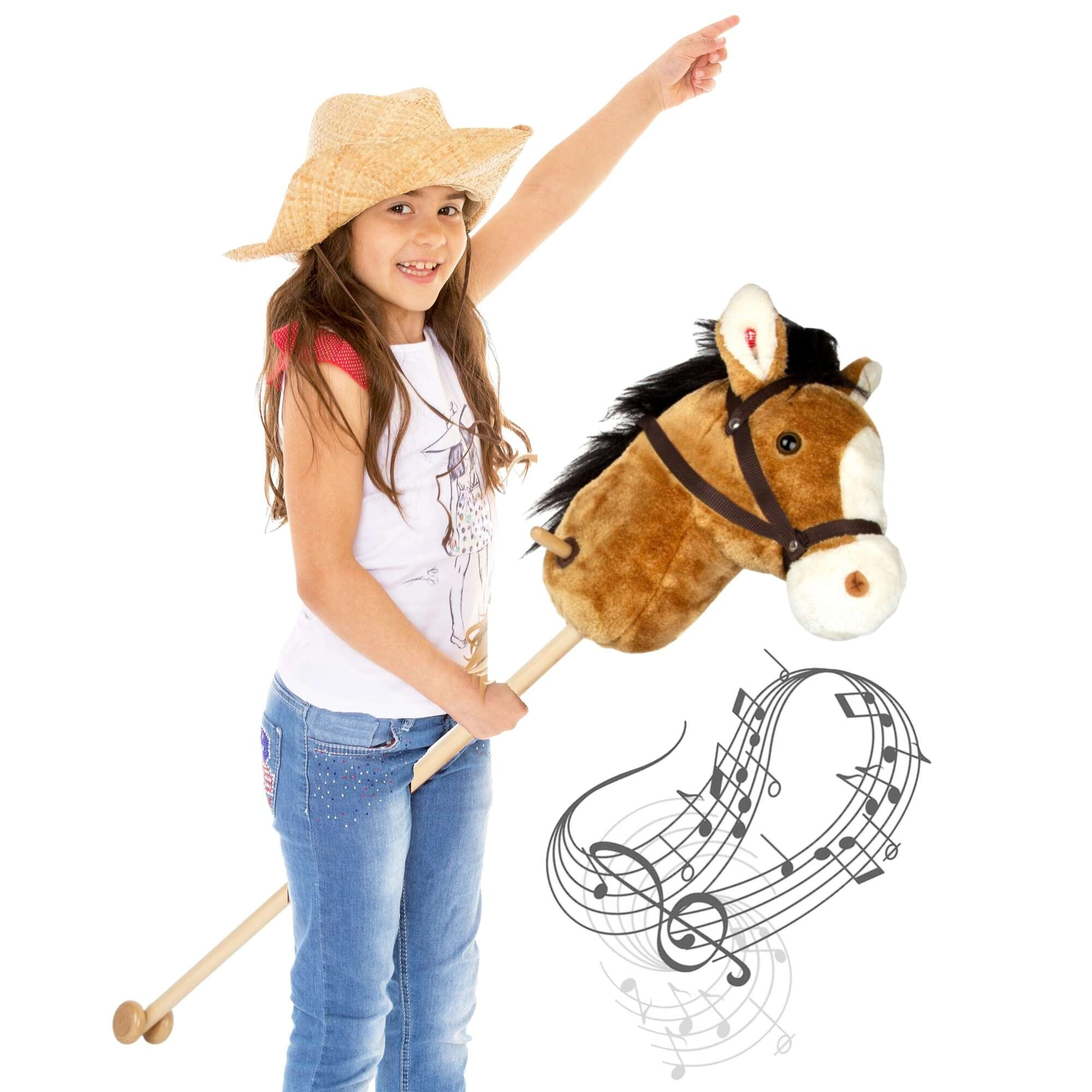 Kij do galopowania jest drewniany i obszyty został miękkim materiałem. U góry znajduje się pluszowa głowa konia z wodzami i lejcami oraz drewnianymi uchwytami. Zabawka została wyposażona w efekt dźwiękowy - odgłosy rżenia i stukotu. Aby je uruchomić, należy wcisnąć przycisk znajdujący w uchu konia.