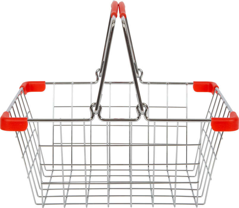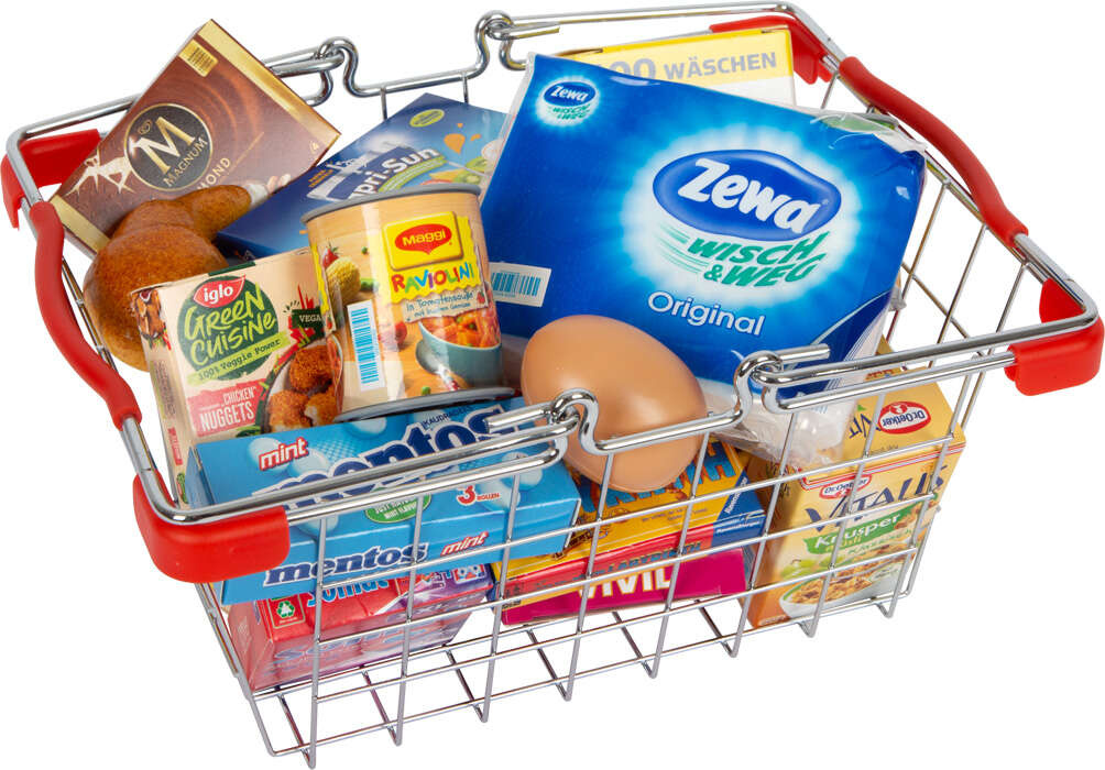W zestawie znajdują się znane produkty spożywcze w kartonikach, puszkach i butelkach oraz metalowy koszyk.