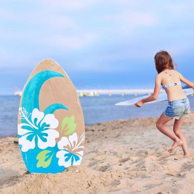 Ta kolorowa deska została wykonana z drewna. Służy to zabawy w wodzie, wykonywania tricków i skimboardingu.