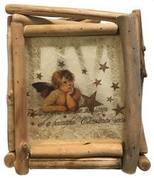 Lampion został wykonany z drewnianych gałązek. Posiada obrazek aniołka na delikatnej tkaninie, który zostaje podświetlony dzięki niewielkiej lampce na baterie, dodając pomieszczeniu świątecznego nastroju.