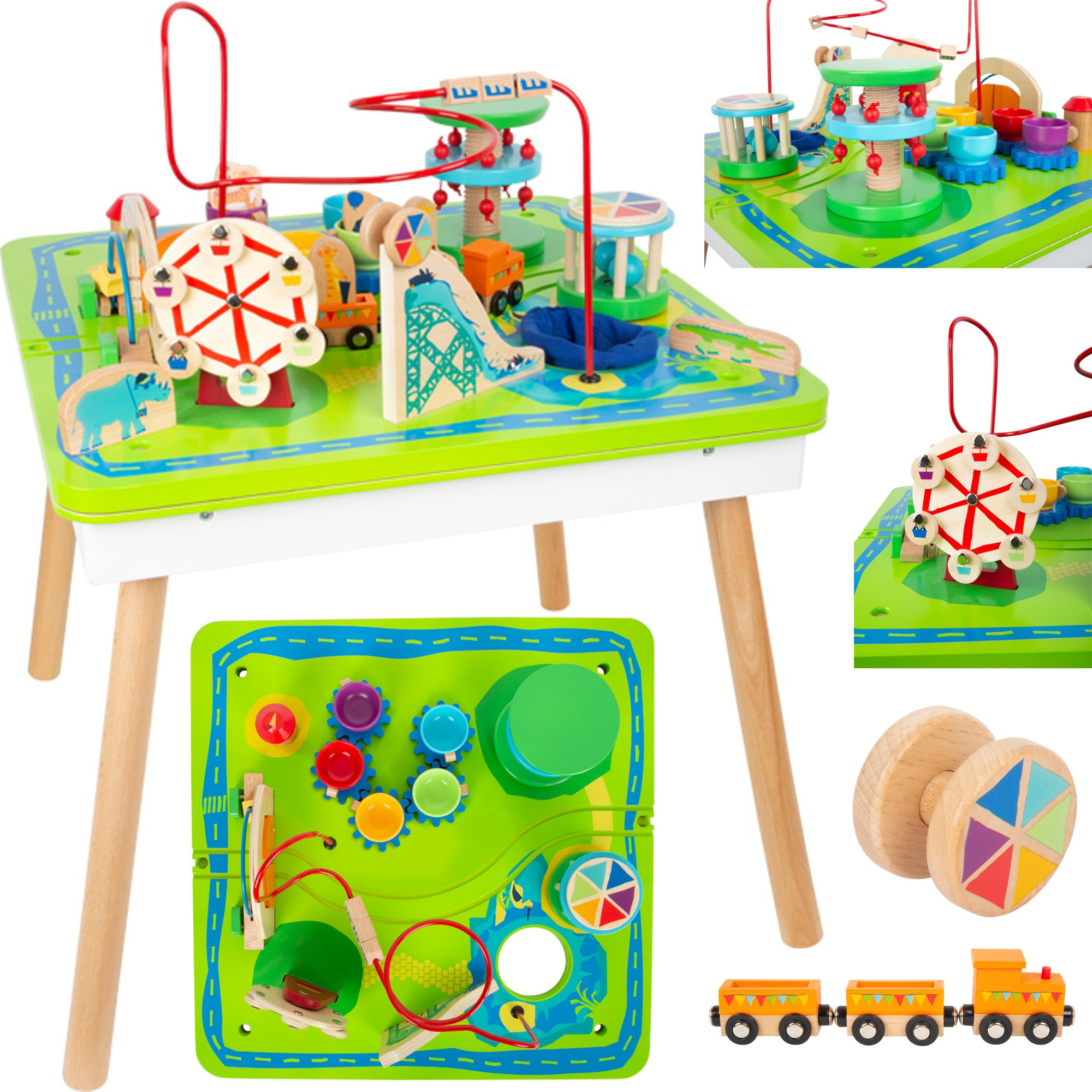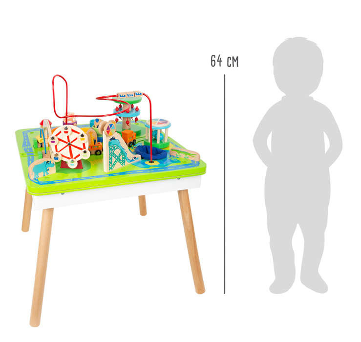 Na drewnianej desce stołu do aktywności ruchowej otwiera się kolorowy świat przygód, na który można grać z czterech stron, który obejmuje tor do przejażdżek górską wodą,