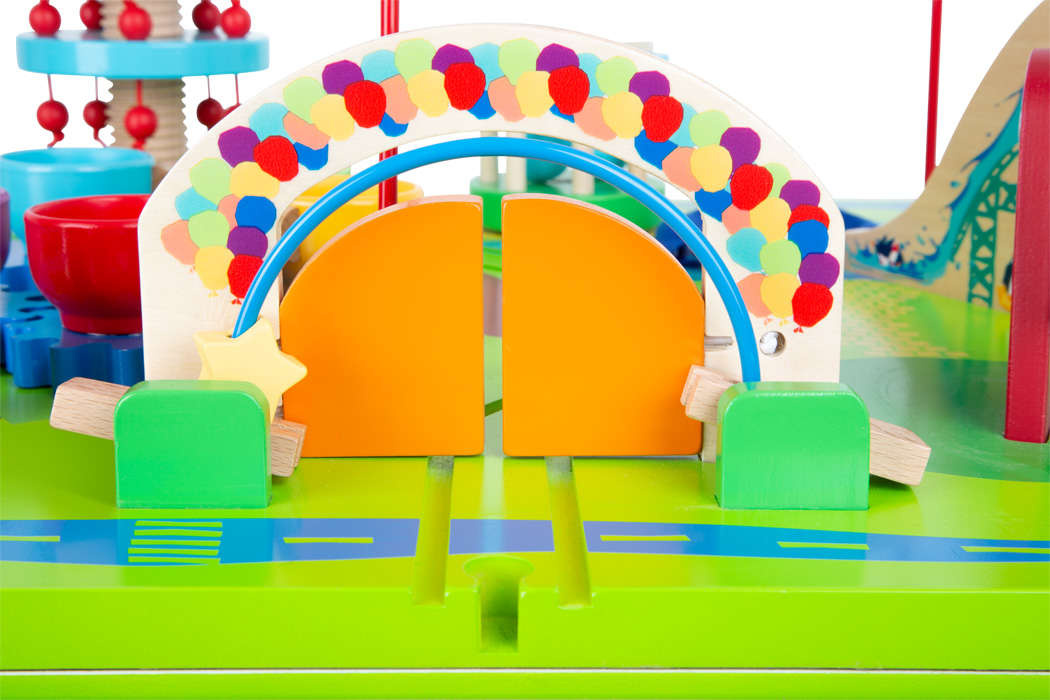 bramę, stoisko z lodami, diabelski młyn, karuzelę i pociąg. Kolejka górska z koralikami i różne elementy do obracania, składania, toczenia i skręcania w zabawny sposób ćwiczą zdolności motoryczne dzieci.