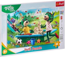 Zestaw puzzli składa się z 15 elementów i umożliwia ułożenie ślicznego, niezwykle kolorowego obrazka przedstawiającego głównych bohaterów animowanej bajki dla dzieci "Rodzina Treflików" bawiących się na świeżym powietrzu. Układanka umieszczona w ozdobnej, spójnej graficznie ramce, tworzącej z obrazkiem bardzo ładną całość. Ułożony obrazek ma wymiary 26 x 16 cm.