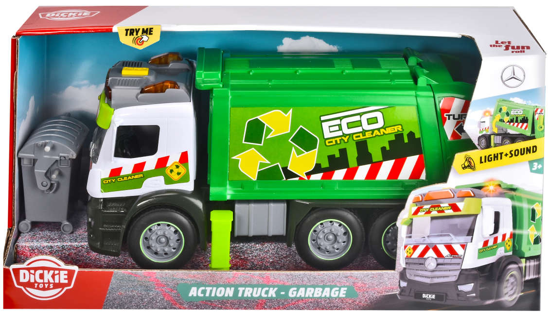 Śmieciarka marki Mercedes posiada otwieraną klapę-wywrotkę, do której można wsypać zawartość szarego kosza na śmieci. Na dachu pojazdu znajduje się przycisk, który uruchamia efekty świetlne; migotanie świateł pojazdu oraz dźwiękowe; odgłosy prawdziwego pojazdu.