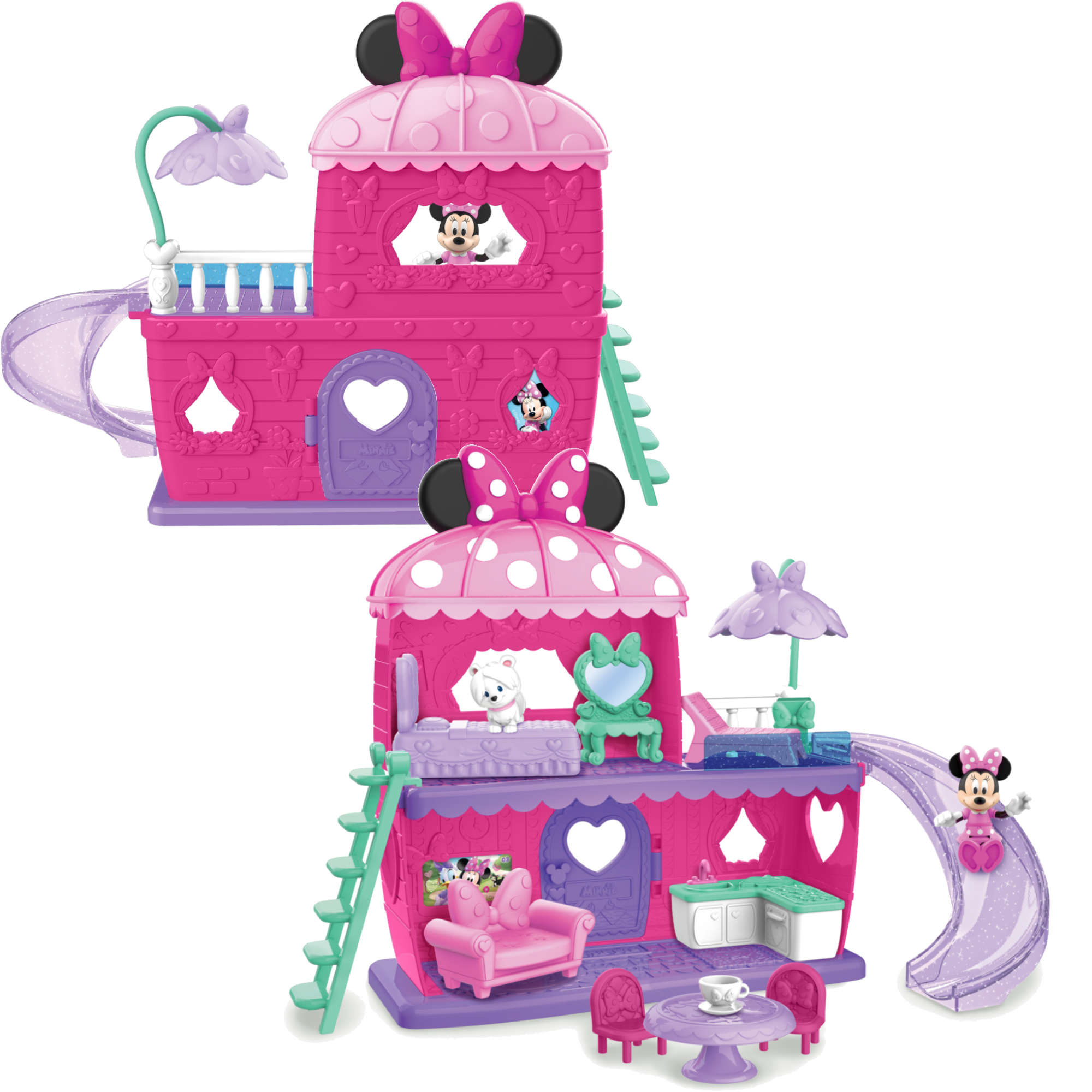 Zestaw zawiera uroczy różowy domek Myszki Minnie. Budynek składa się z 2 pięter, z 2 pomieszczeniami. Na górze znajduje się sypialnia z balkonem, a na dole salon z aneksem kuchennym.