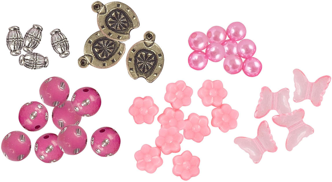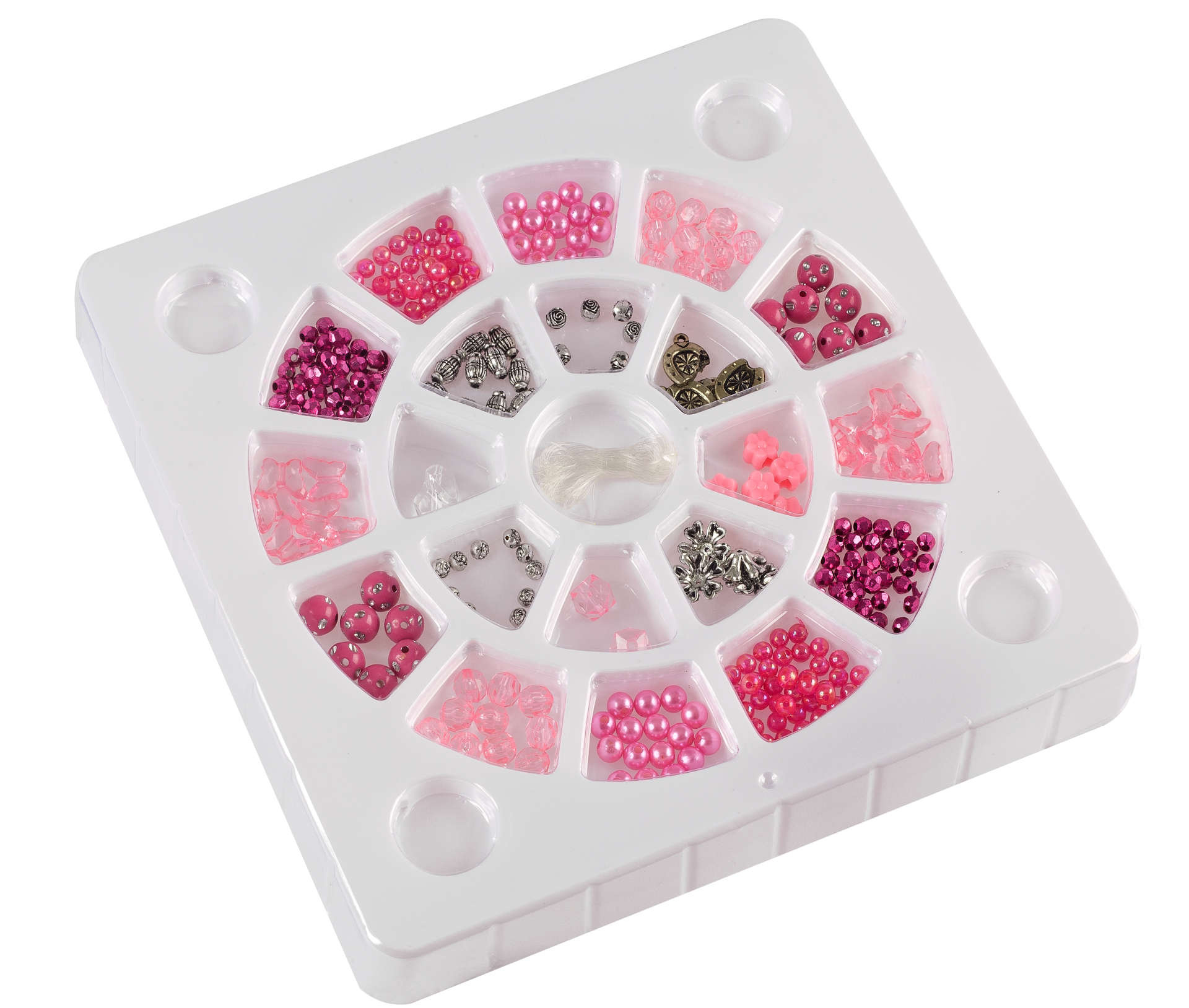 - Zestaw umożliwia samodzielne stworzenie bransoletek. Koraliki mają różne odcienie różu, bądź srebra i różne kształty.