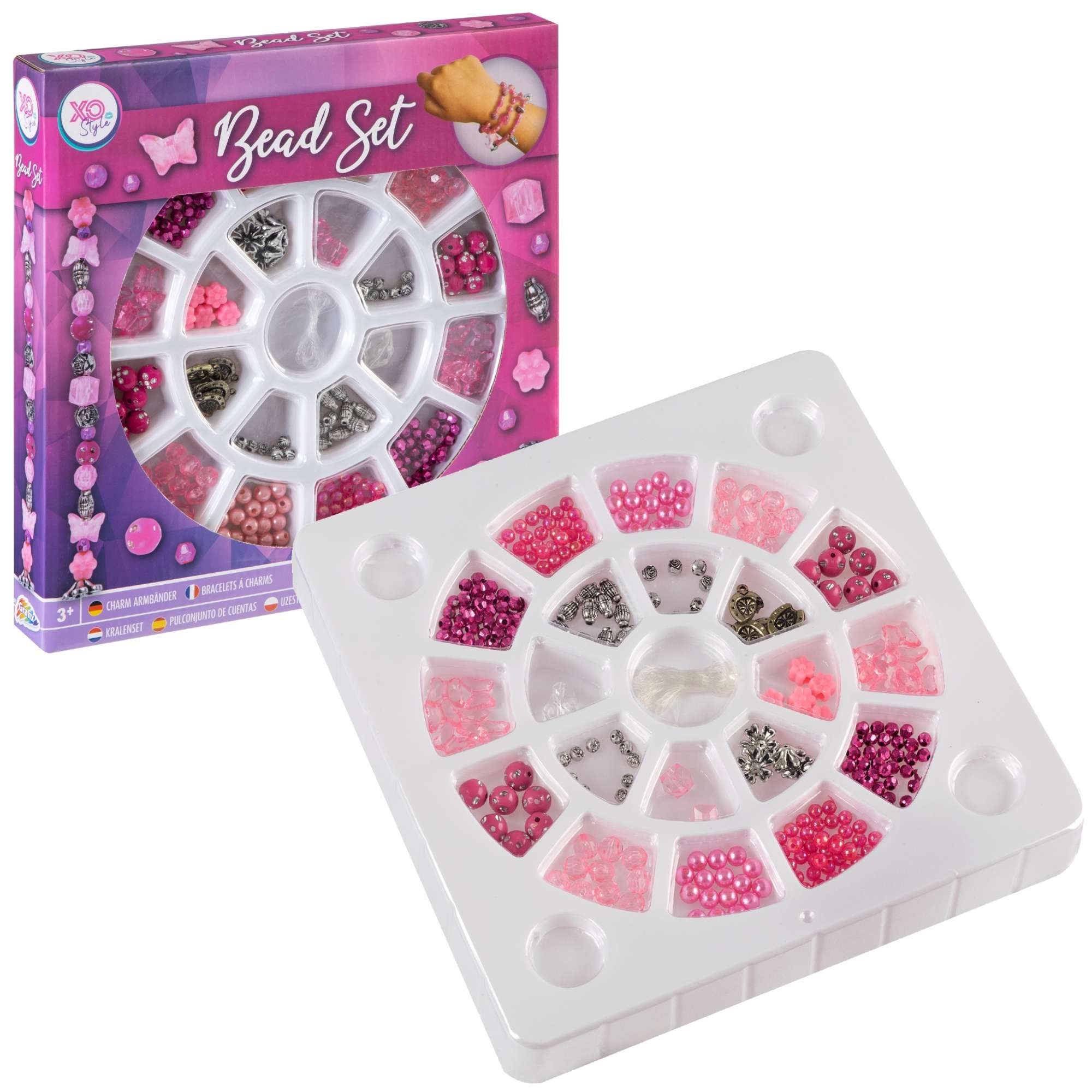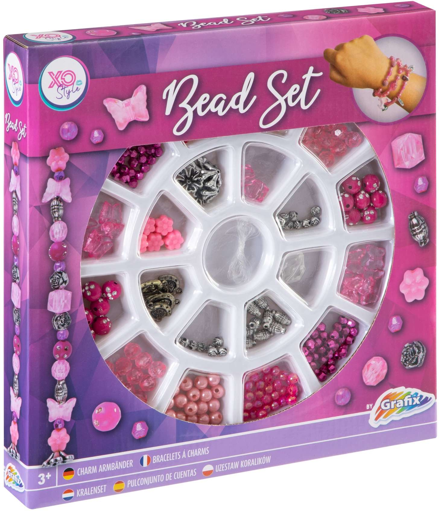 Zestaw umożliwia samodzielne stworzenie bransoletek. Koraliki mają różne odcienie różu, bądź srebra i różne kształty.