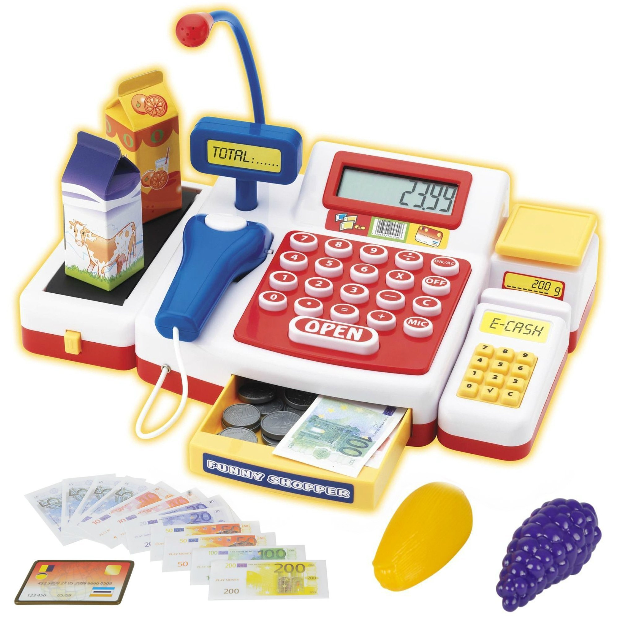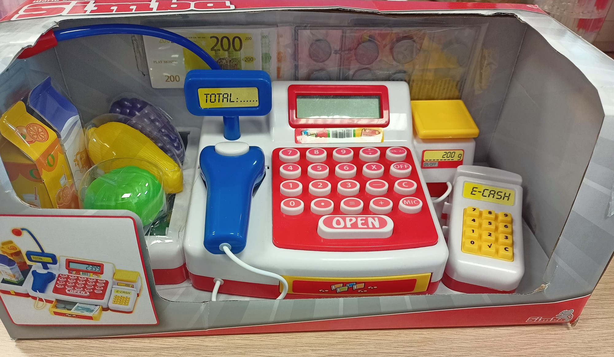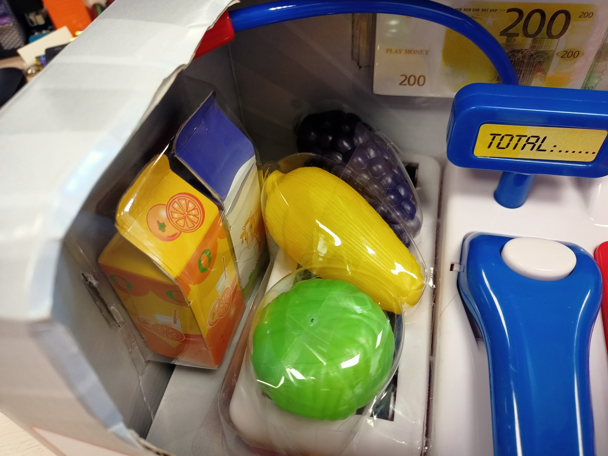 - Kasa sklepowa wraz z akcesoriami m.in. skanerem kodów kreskowych, mikrofonem (atrapa), wagą, czytnikiem kart płatniczych, ruchomą taśmą do wykładania zakupów, pieniędzmi oraz imitacjami artykułów spożywczych.