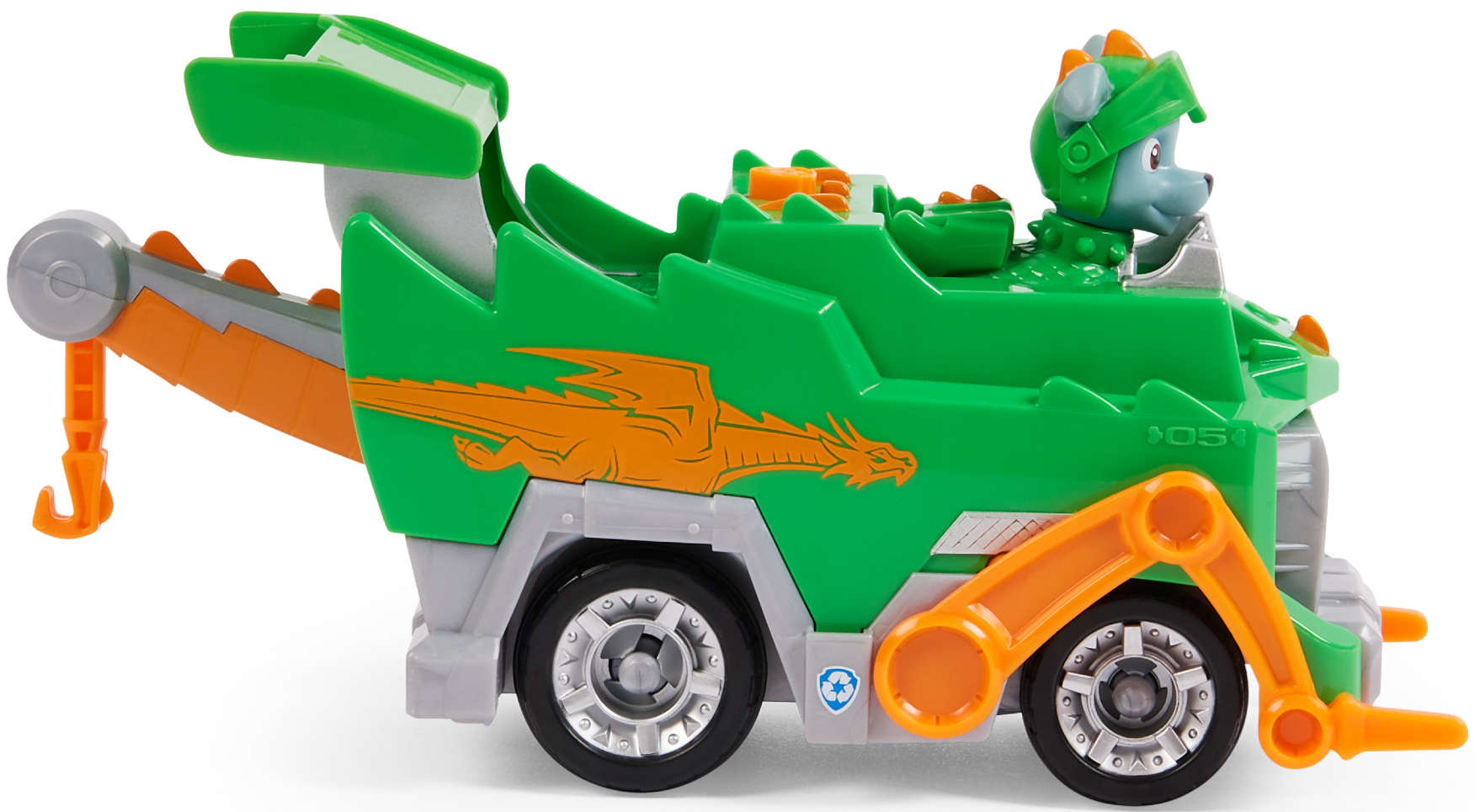 Samochód Deluxe Rocky to zielono-szary pojazd z hakiem. Pojazd ma detale i stylizację inspirowane smokami oraz ekscytującą transformację narzędzia ratunkowego. Aby uruchomić hak wystarczy docisnąć je w dół.