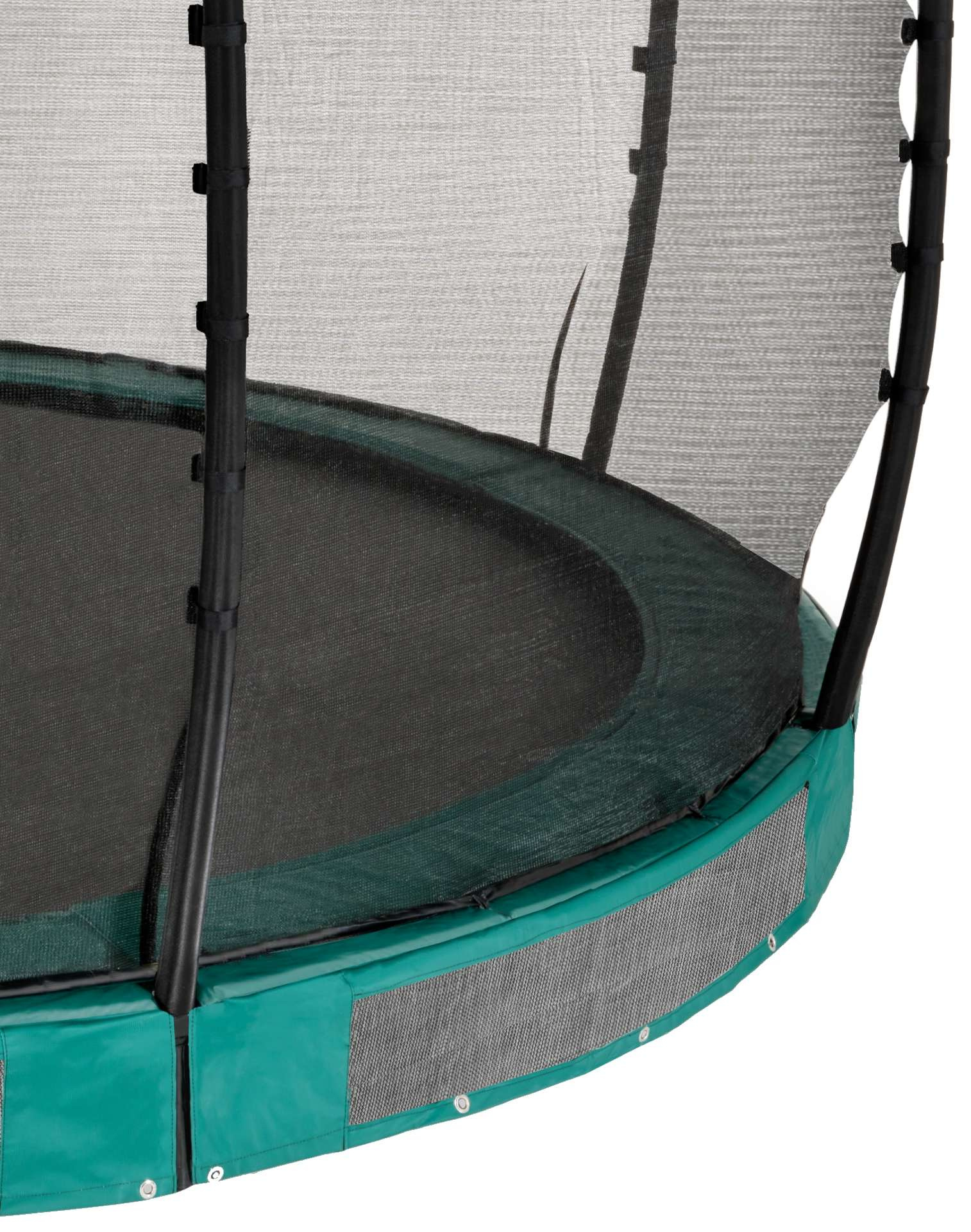 Dodatkowo trampolina jest wyposażona w siatkę zabezpieczającą. Siatka zabezpieczająca ma zachodzące na siebie wejście, które zamyka się automatycznie, dzięki czemu nigdy nie może pozostać otwarte niezauważone. Rurki siatki zabezpieczającej również pokryte są pianką.