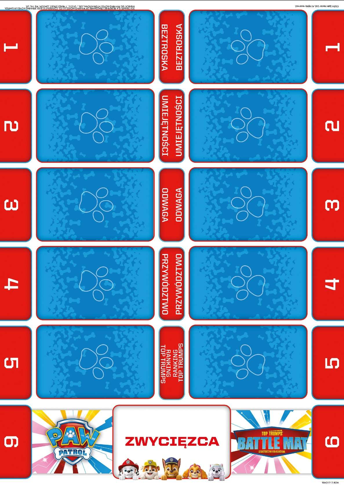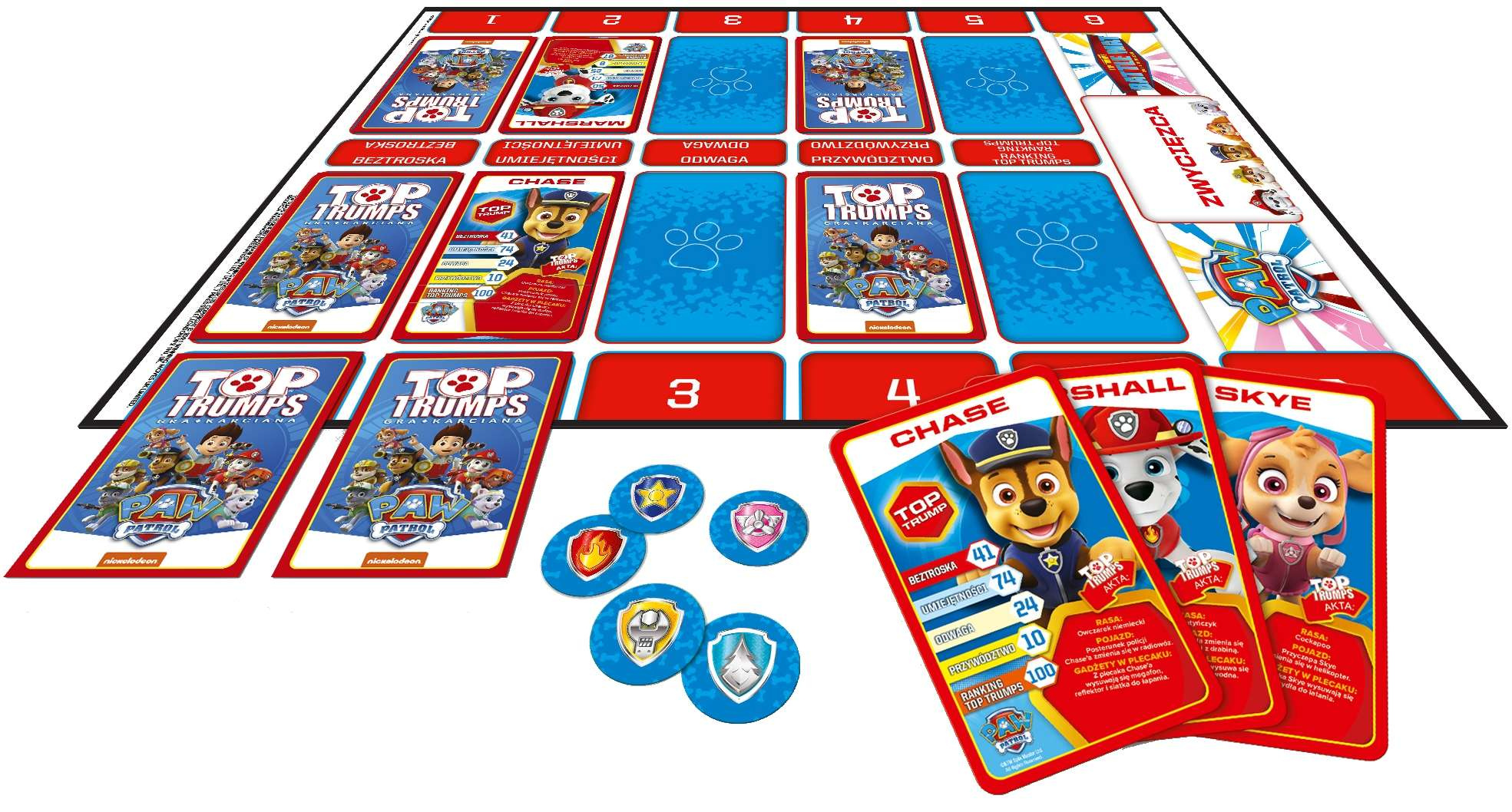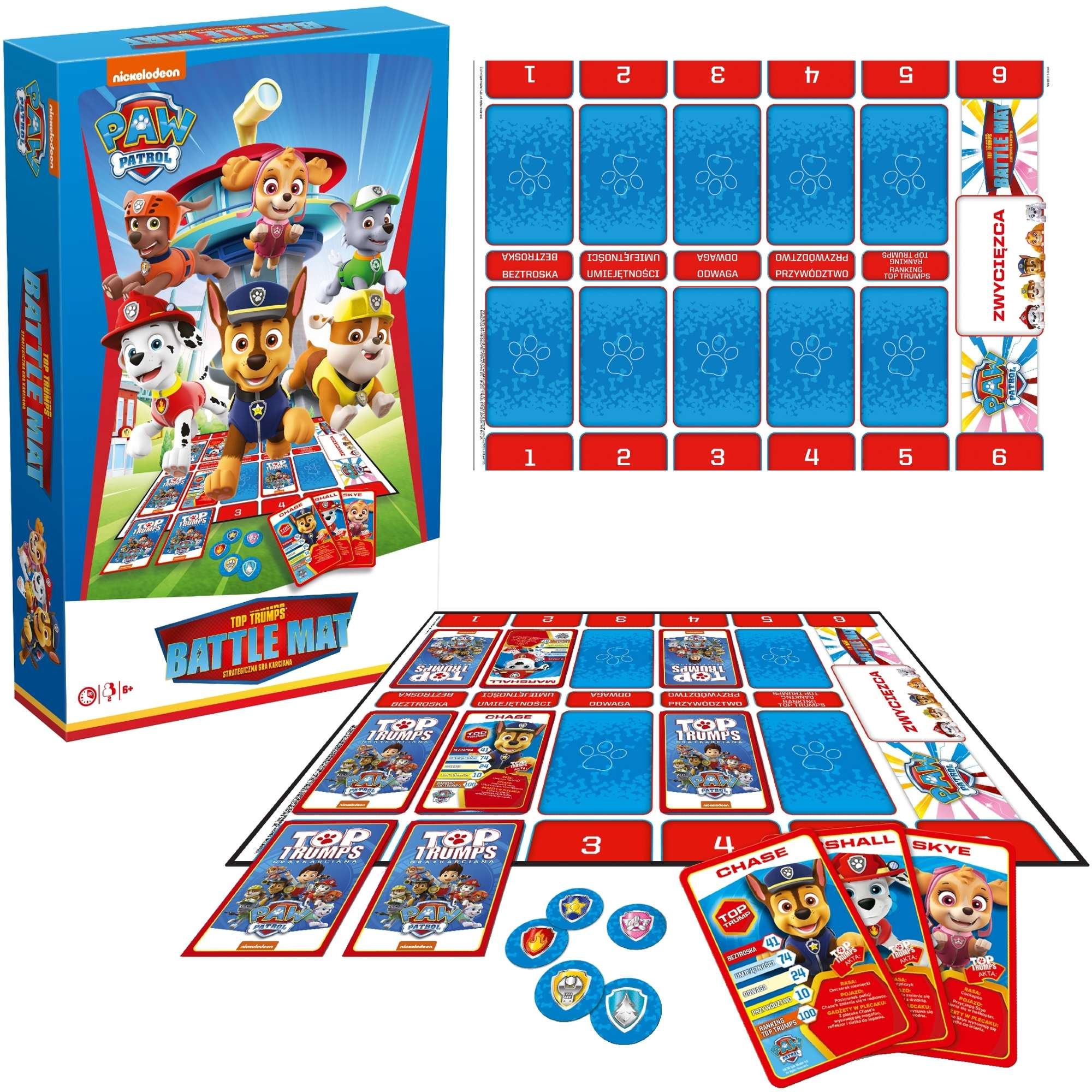 - Zawartość gry: plansza bitewna, talia gry Top Trumps Psi Patrol, 5 żetonów zdolności, instrukcja.