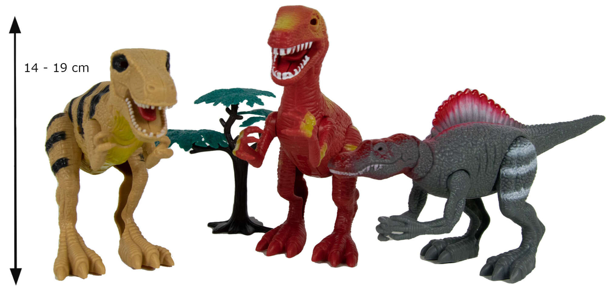 ✅ Zestaw zawiera aż trzy dinozaury, które mają ruchome łapy. Dodatkowo po naciśnięciu jednej z łap figurki wydają z siebie realistyczny ryk, a ich oczy świecą się! Efekty dźwiękowe i świetlne zachwycą dziecko, pobudzą jego kreatywność i zachęcą do dalszego poznawania świata dinozaurów i poszerzania swojej wiedzy o tajemniczych, odległych czasach prehistorii.