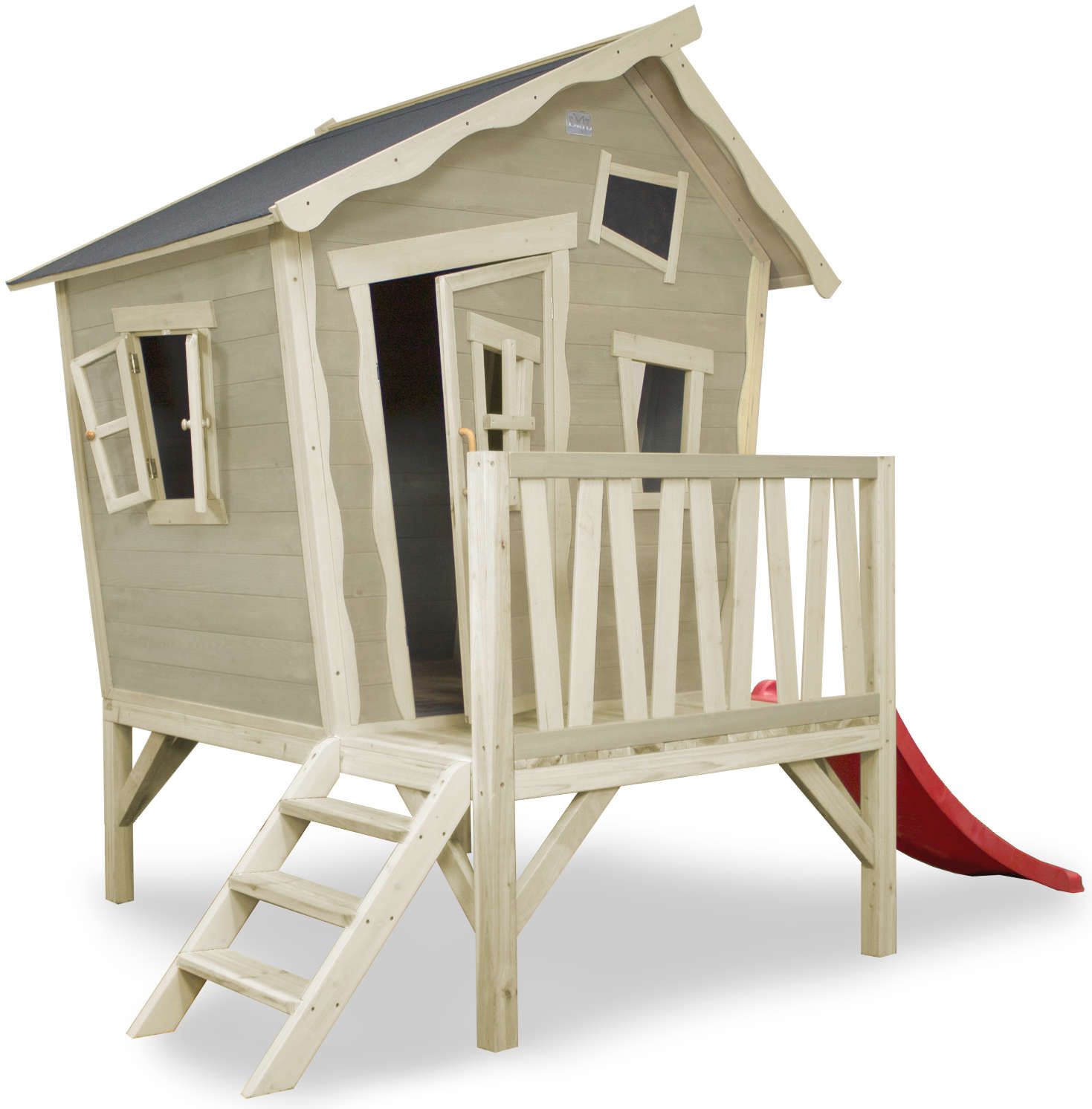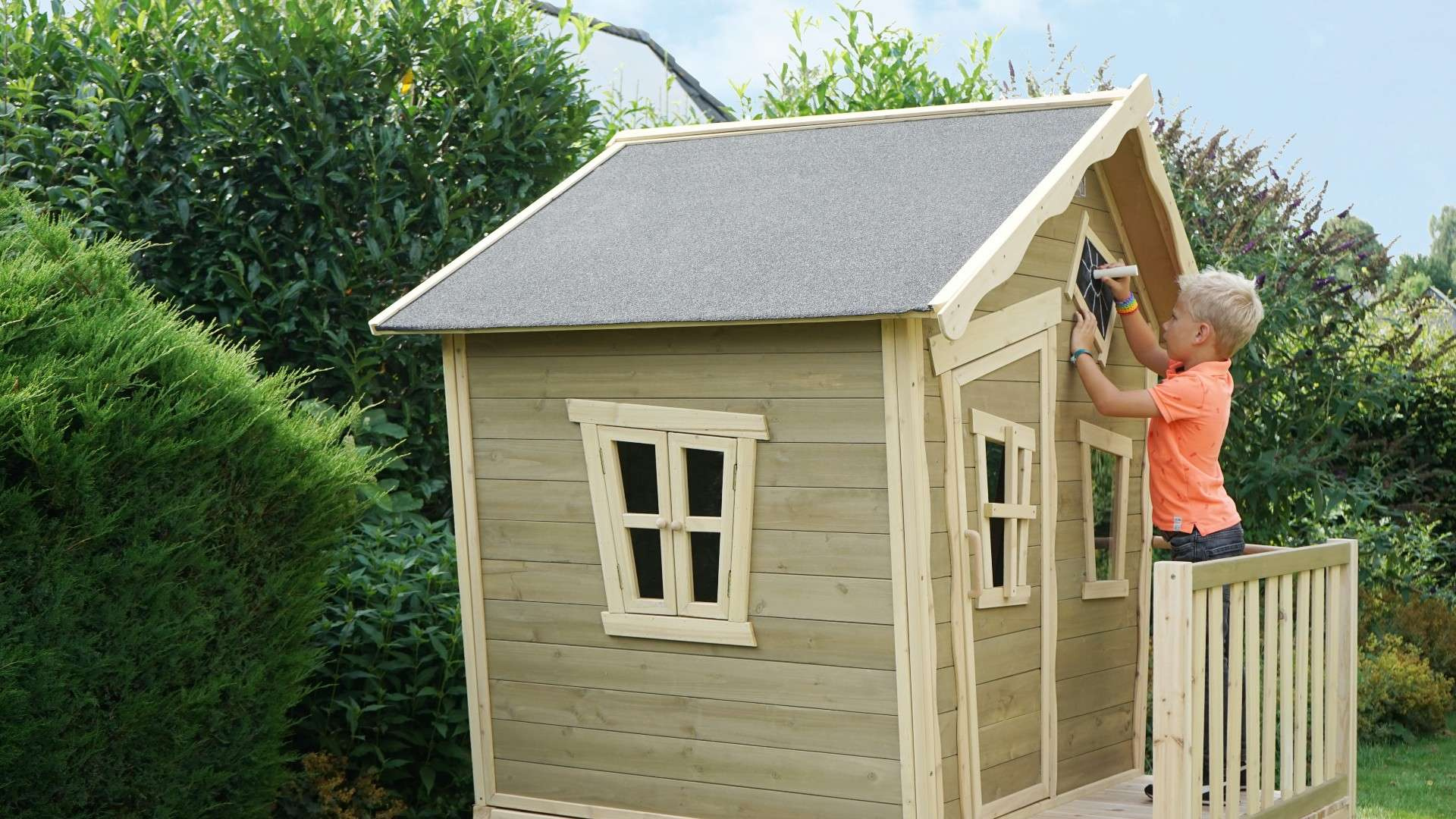 Drewniany domek ogrodowy EXIT Crooky 300 w kolorze szaro-beżowym to świetne miejsce, w którym dzieci mogą bawić się godzinami.