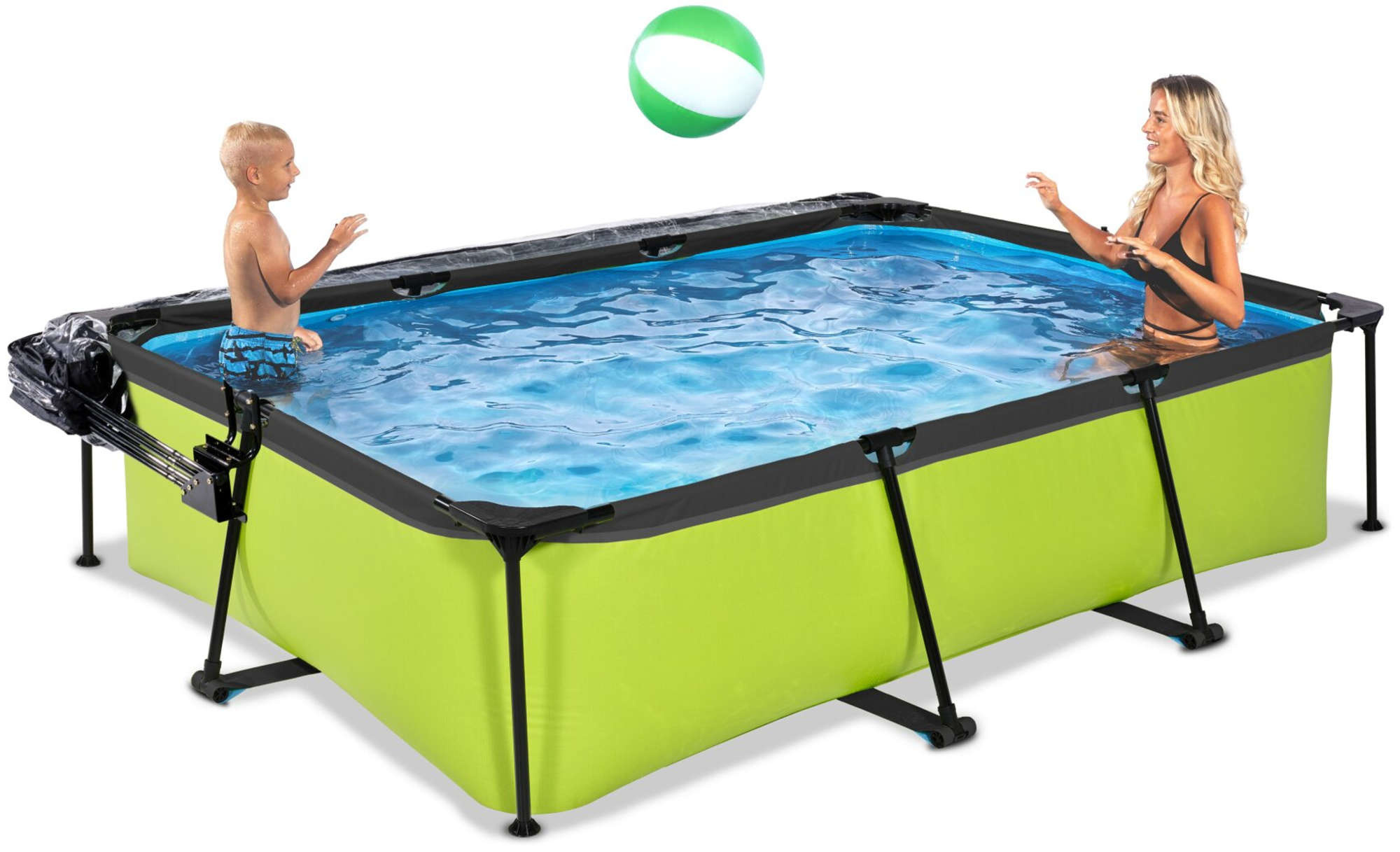 Basen EXIT Wood 300 x 200 x 65 cm to prostokątny basen z ramą w intensywnie zielonej kolorystyce. Basen jest standardowo wyposażony w pompę filtrującą utrzymującą wodę w czystości i pokrywę dającą cień.
