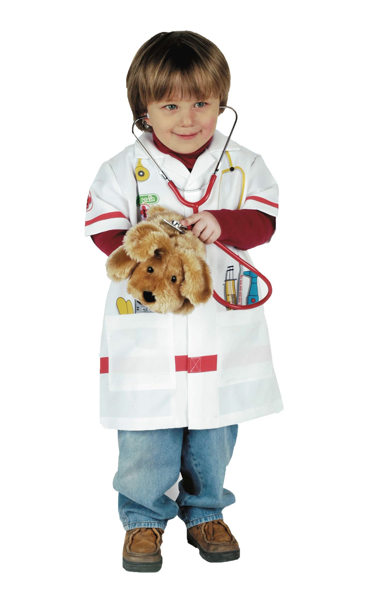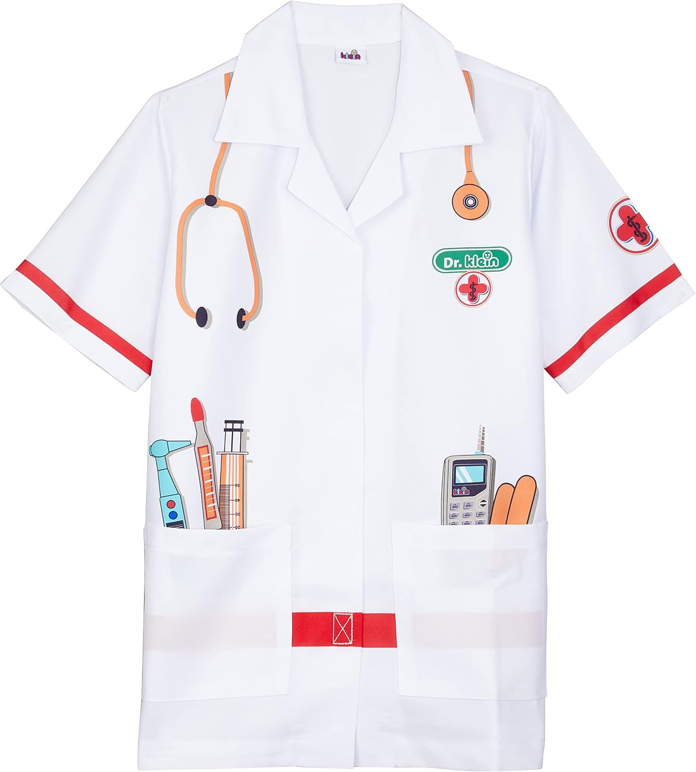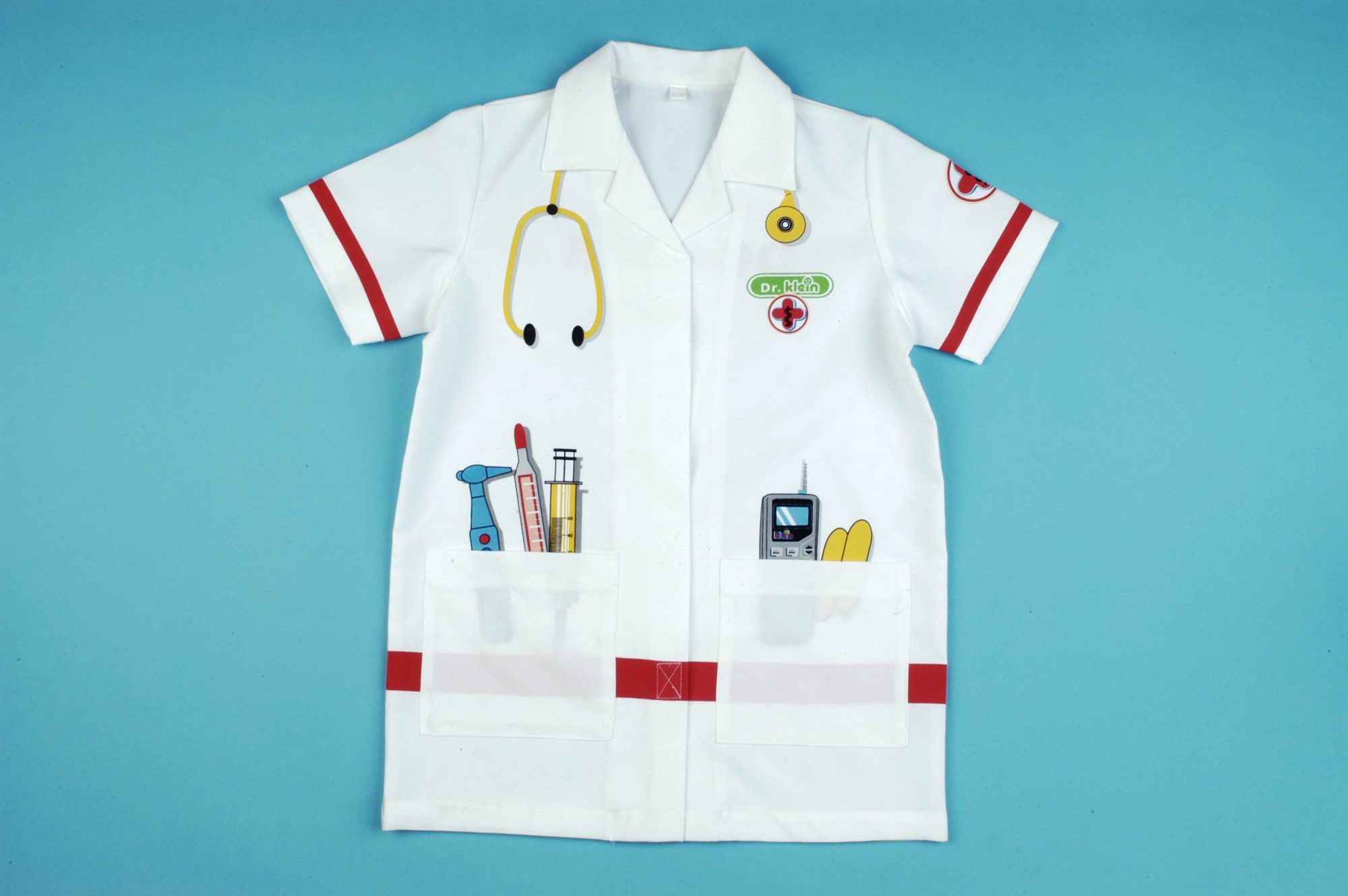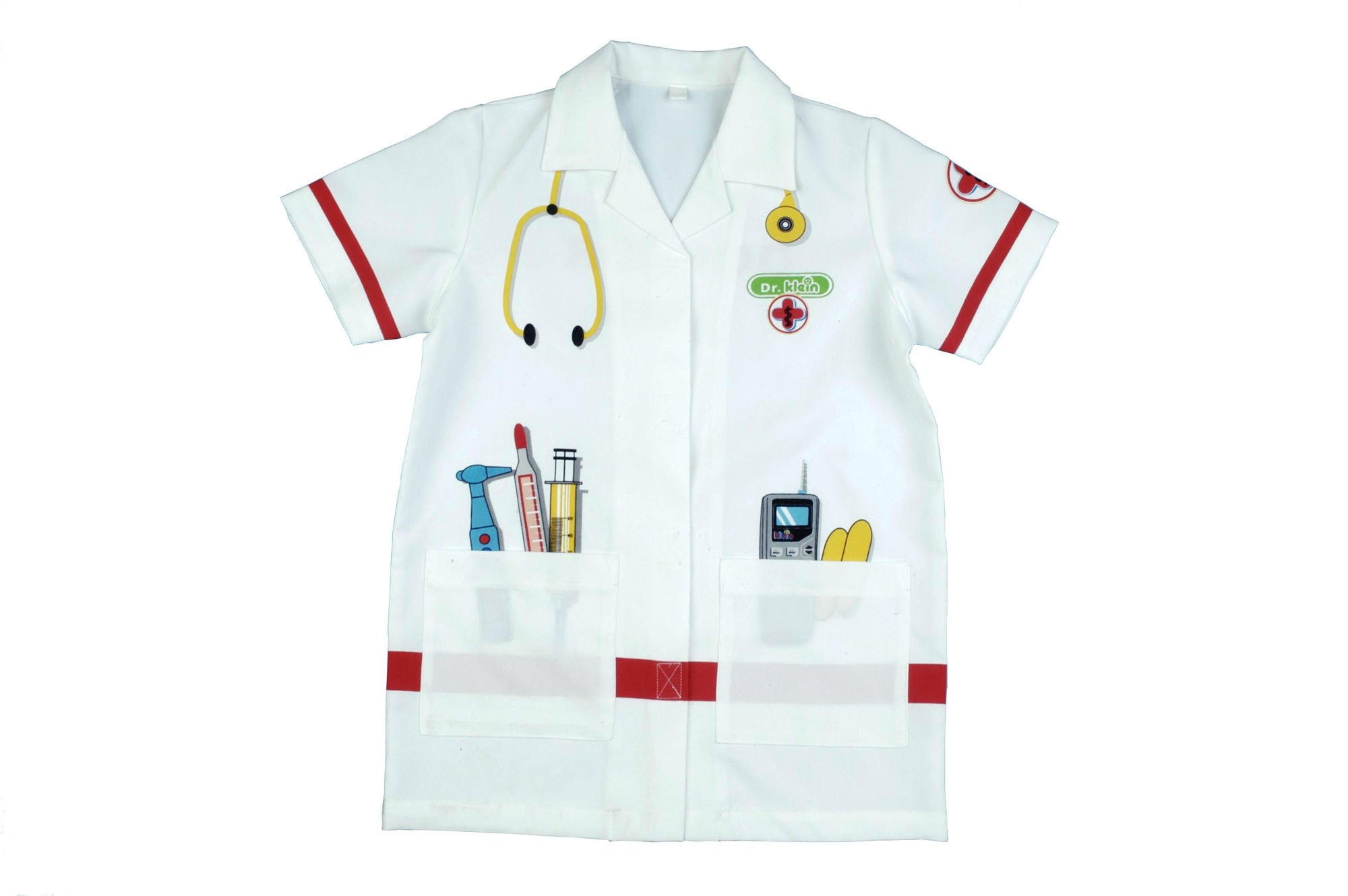 Fartuszek ten jest w kolorze białym, a zdobi go kolorowa grafika przedstawiająca różne przyrządy lekarskie, na przykład stetoskop, termometr czy strzykawka. Fartuszek posiada kołnierzyk, krótkie rękawki oraz dwie kieszonki, a zapinany jest na rzepy. Dzięki takiemu krojowi pasuje na dzieci w wieku 3-5 lat, a jego uniwersalny charakter sprawia, że doskonale nadaje się zarówno dla dziewczynek, jak i chłopców.