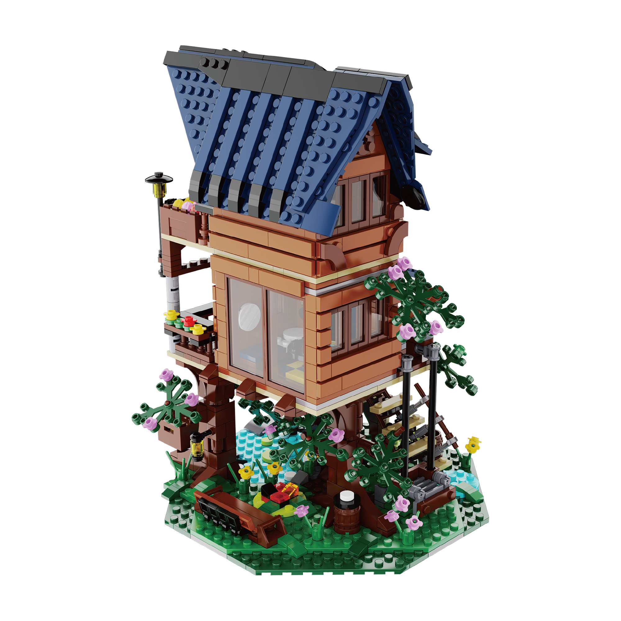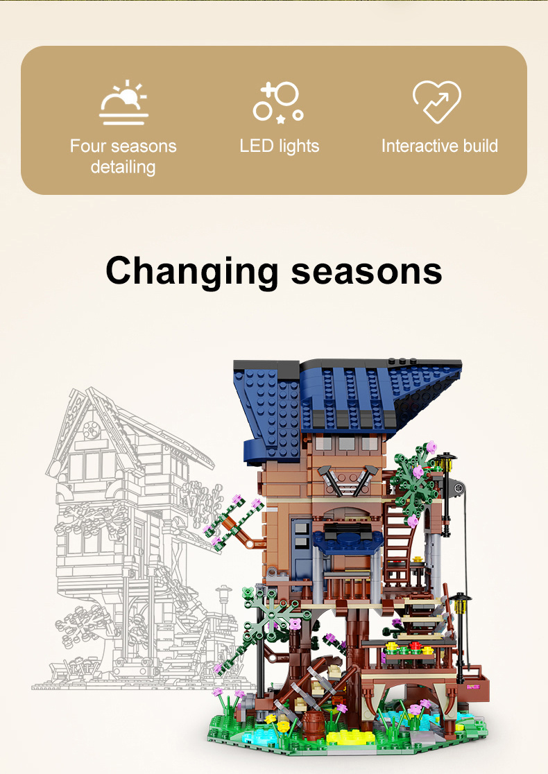 - Zestaw składa się z 1155 elementów i umożliwia samodzielne złożenie uroczego domku na drzewie, który wyposażony został w wiele szczegółów oraz światełka LED. Domek posiada ruchome elementy, dzięki czemu wydaje się realistyczny.