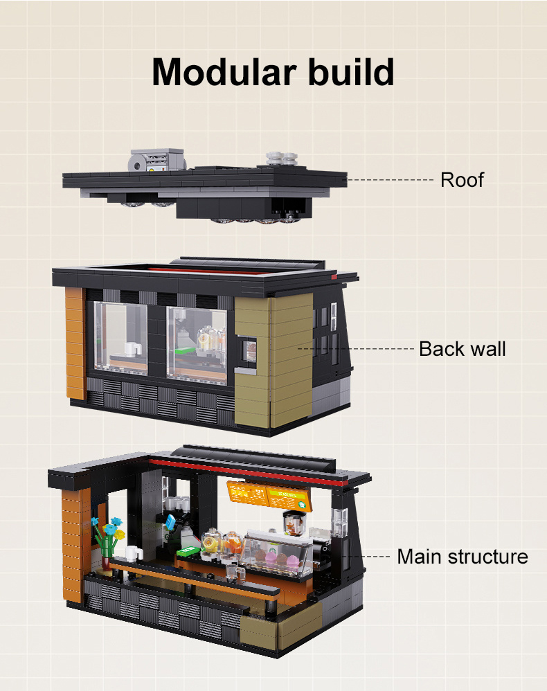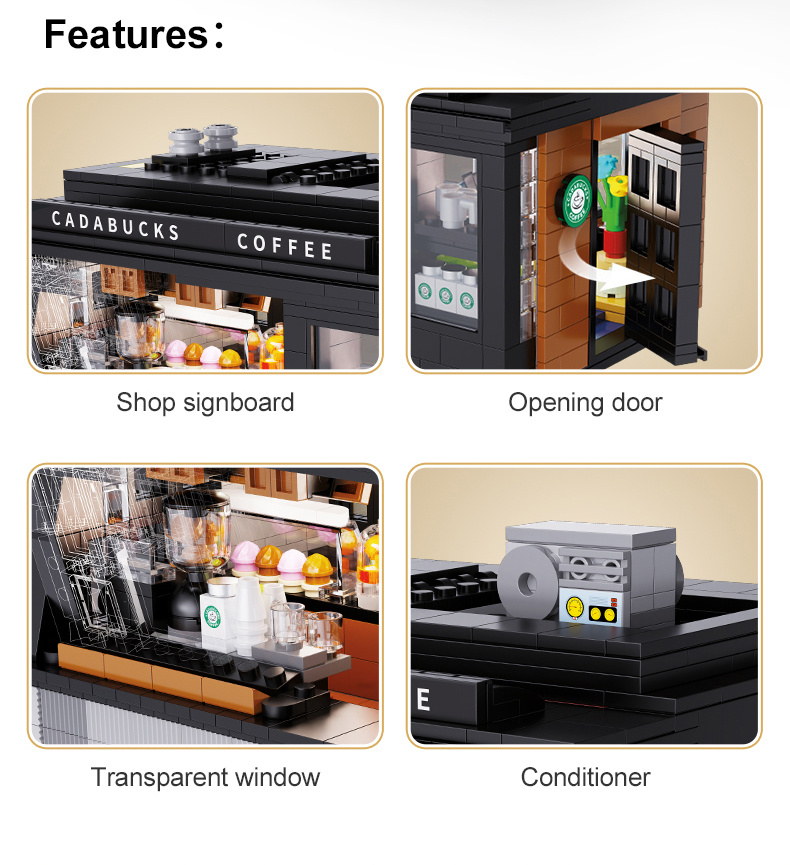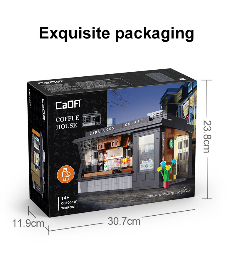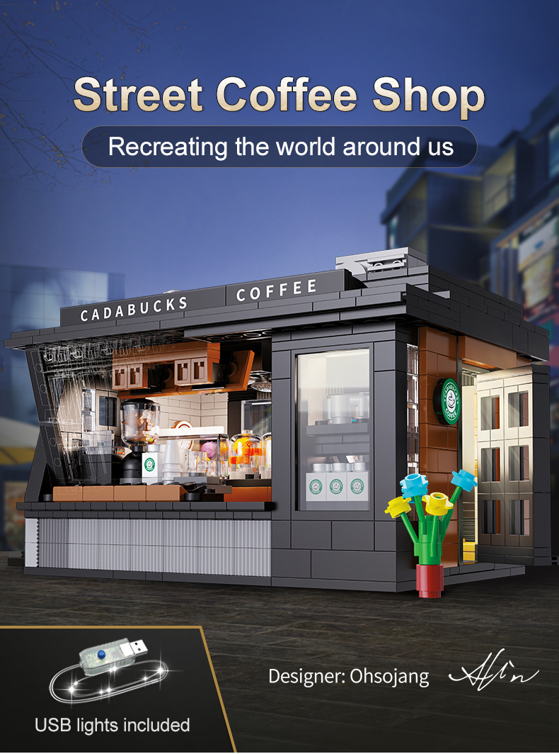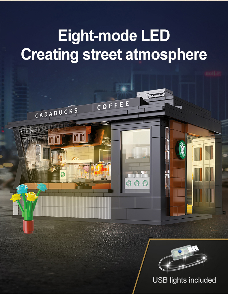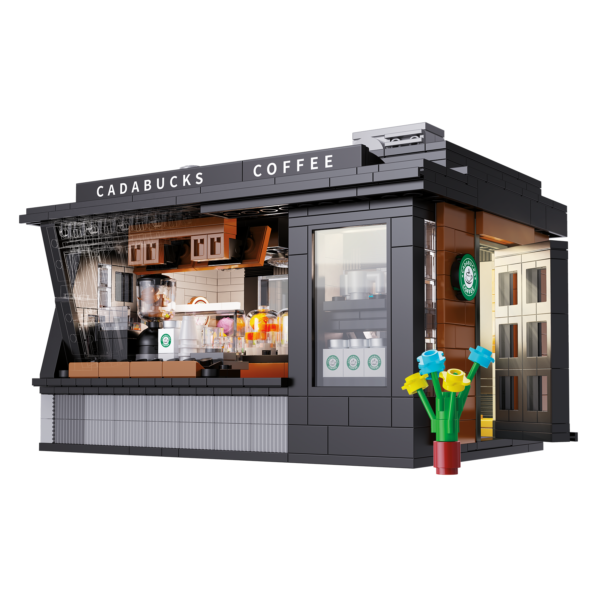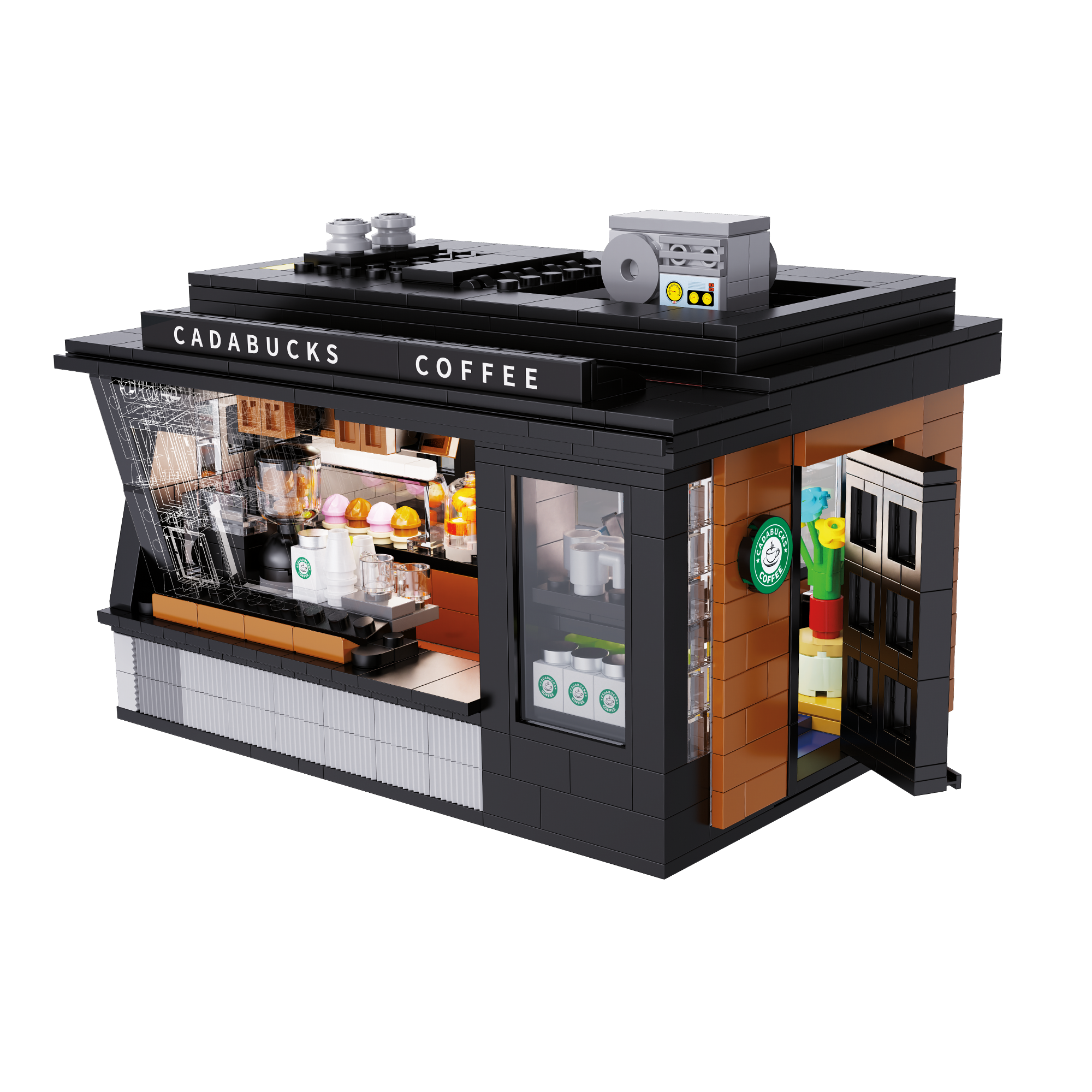 Zestaw składa się z 768 elementów i umożliwia samodzielne złożenie małej kawiarni Cadabucks, która wyposażona została w wiele szczegółów oraz światełka LED. Kawiarnia posiada ruchome elementy, dzięki czemu wydaje się realistyczna. Większość detali wewnątrz budynku można zobaczyć przez okno: elementy strefy baristy, takie jak ekspres do kawy, deser, ziarna kawy, menu, a także elementy znajdujące się w strefie klienta, takie jak długi stół, roślina, kubki do kawy. Z zewnątrz widać okno sklepowe, szyldy, klimatyzator, drzwi. Tył i dach budynku można odczepić, aby w łatwy sposób mieć dostęp do wnętrza. Włączenie taśmy LED sprawi, że w pełni można odczuć klimat kawiarni. Zestaw zapakowany został w eleganckie opakowanie, dzięki czemu zabawka świetnie sprawdzi się jako prezent.