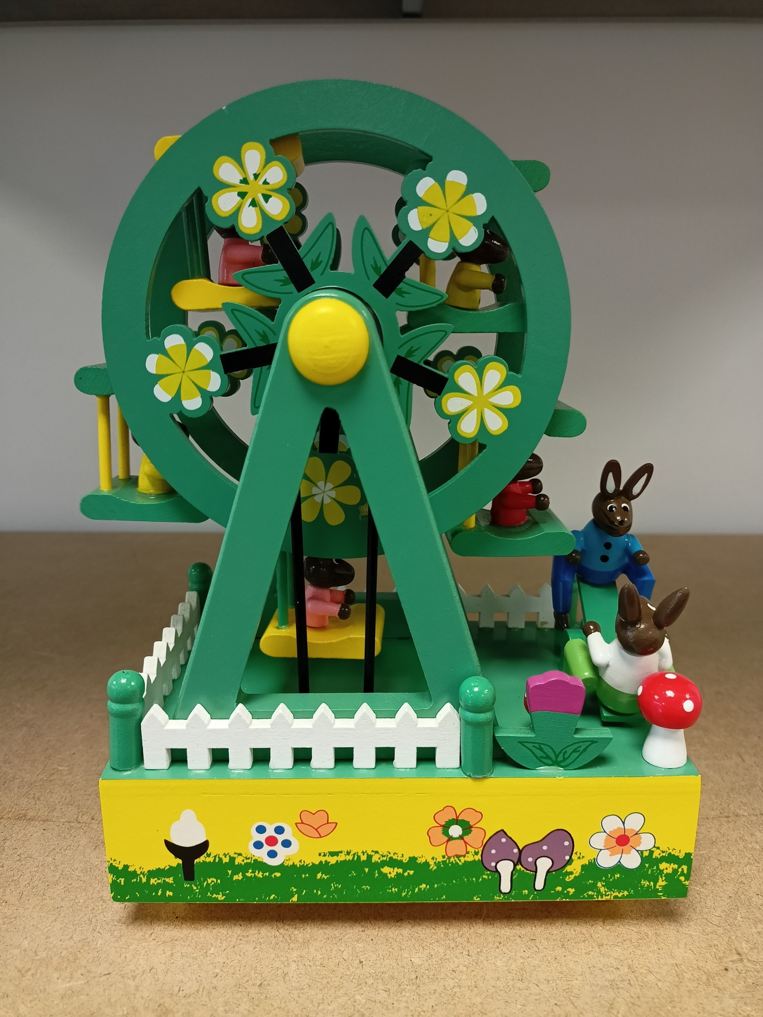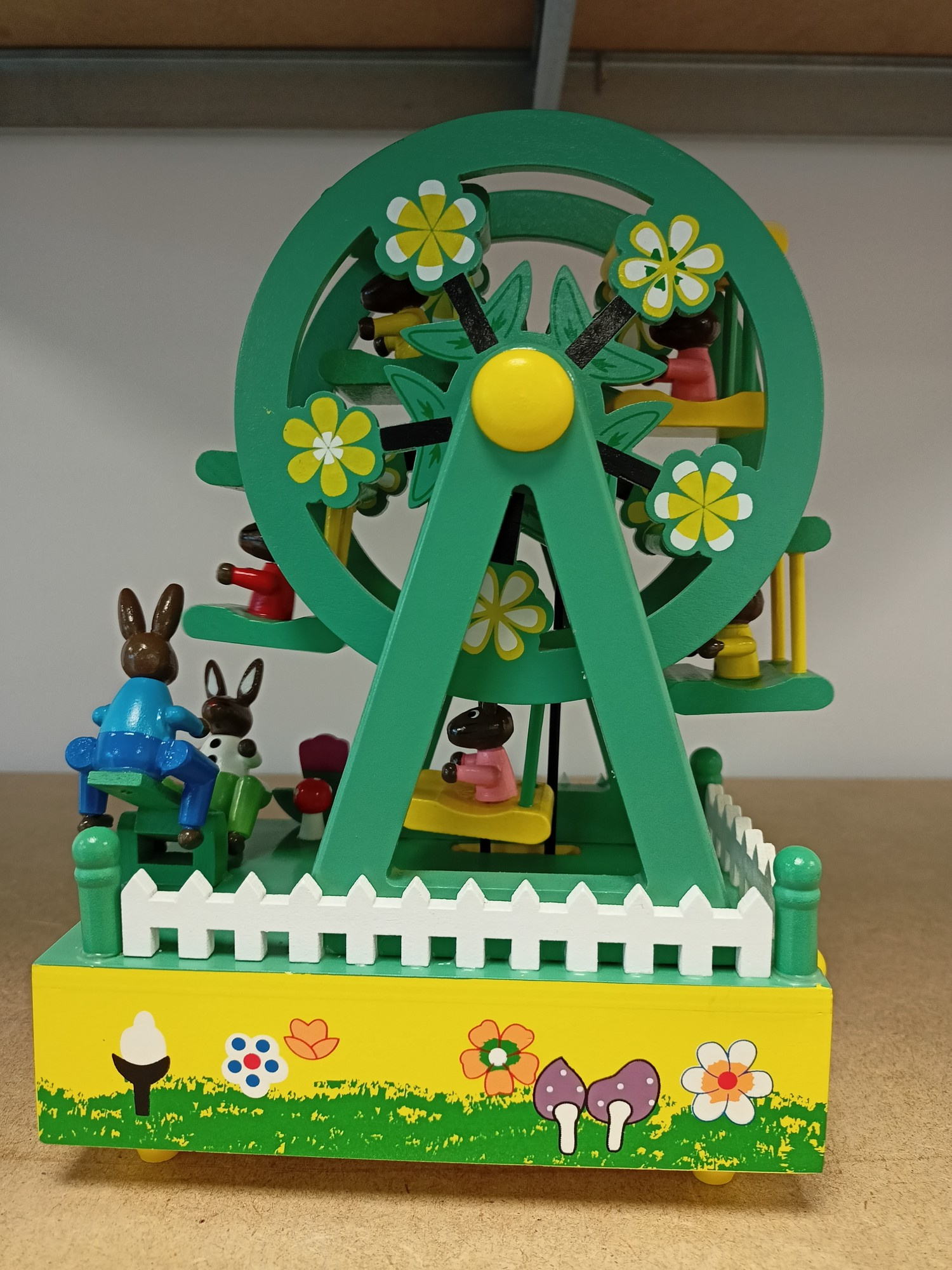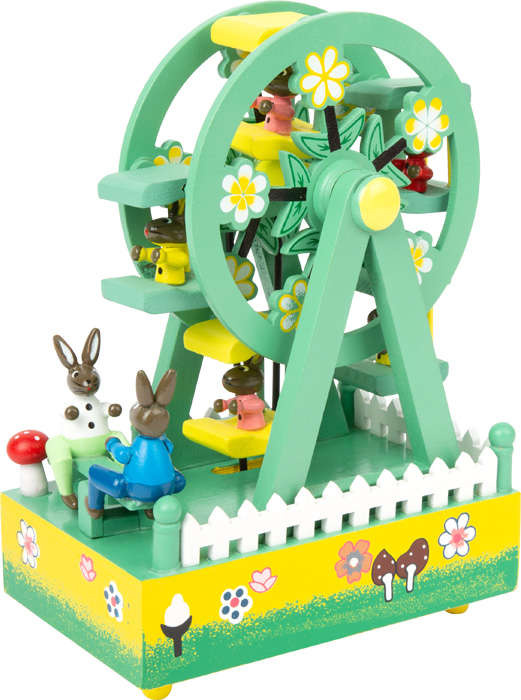Pozytywka jest w kształcie diabelskiego młynu, z wykonanymi z dbałością o szczegóły figurkami króliczków. Całość została wykonana z drewna.