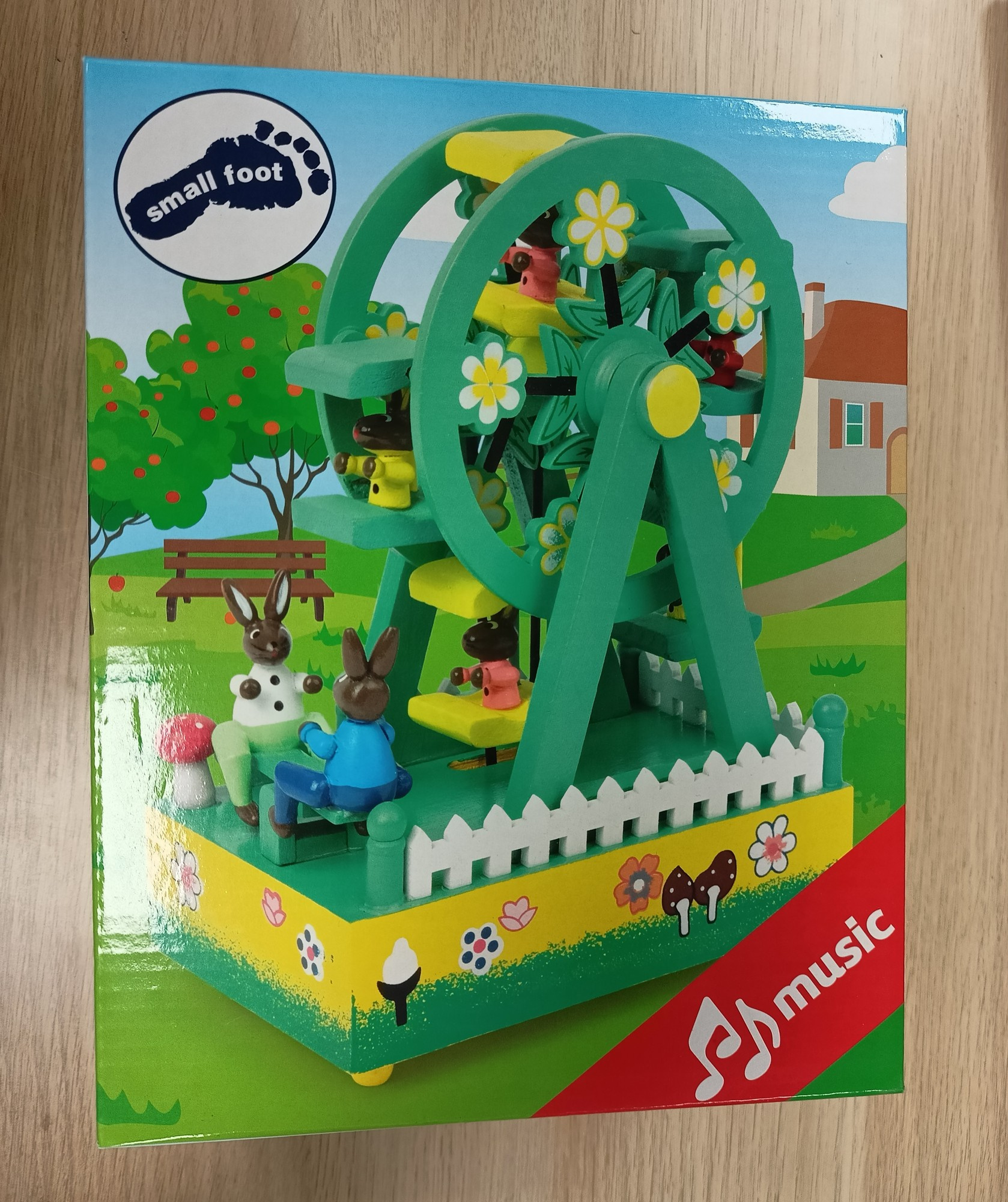 - Pozytywka jest w kształcie diabelskiego młynu, z wykonanymi z dbałością o szczegóły figurkami króliczków. Po nakręceniu pozytywki, diabelski młyn się porusza i usłyszeć można melodię piosenki "Over the rainbow".