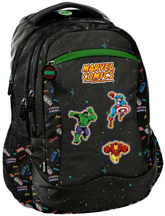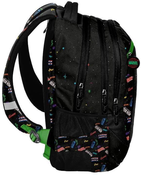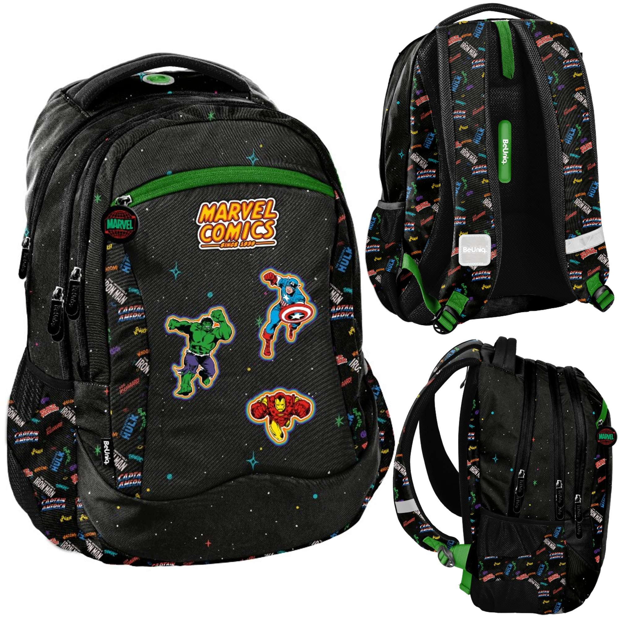 Plecak jest w kolorystyce czarnej, posiada naszywki z postaciami Marvela. Został wykonany z najwyższej jakości materiałów. Jest lekki, ma usztywniane, profilowane plecy oraz wygodne, ergonomiczne szelki.