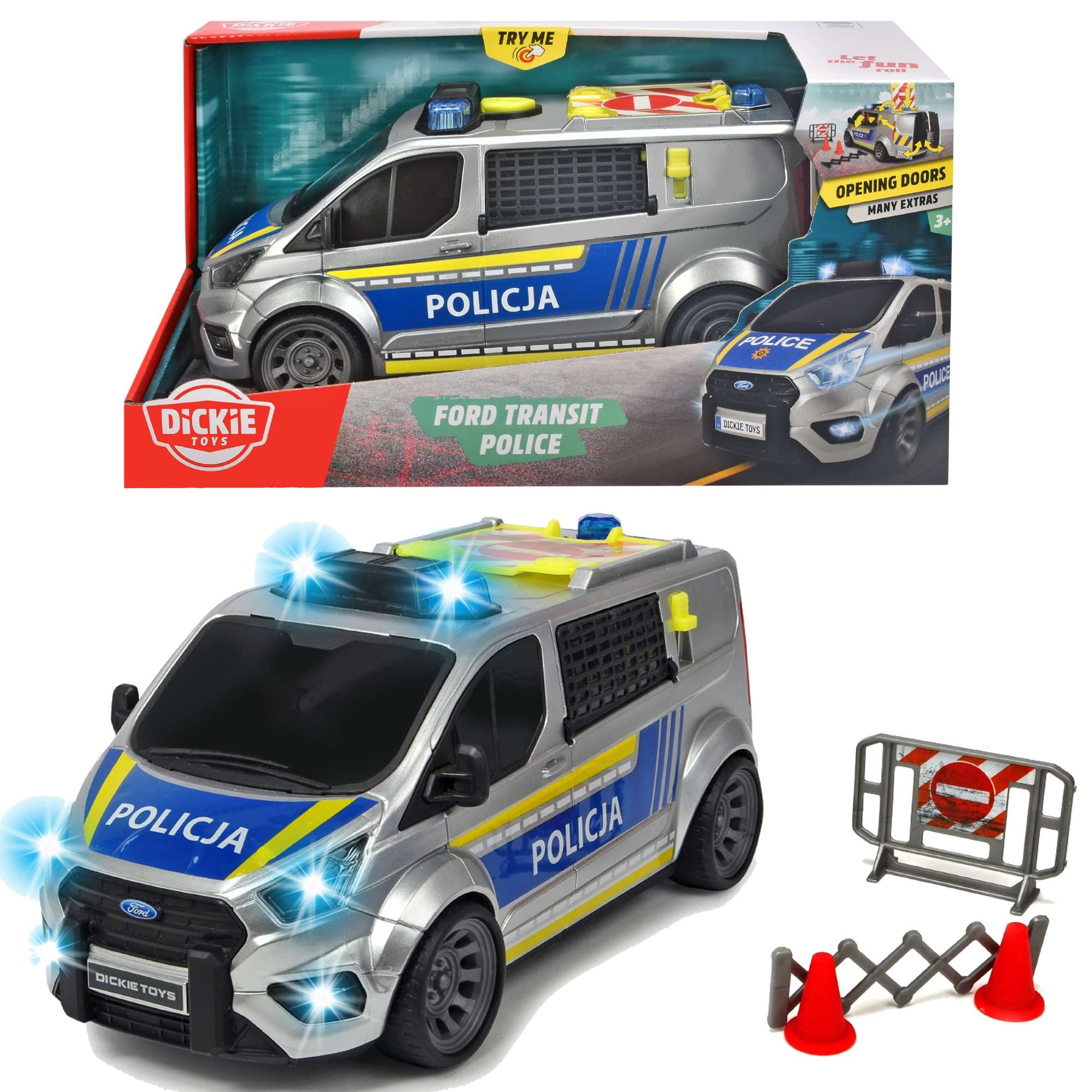 - Ford transit ma srebrną karoserię z niebieskimi i żółtymi elementami. Na drzwiach oraz masce auta znajduje się napis Policja. Pojazd posiada 4 duże, plastikowe koła. Posiada wiele ruchomych i otwieranych elementów.