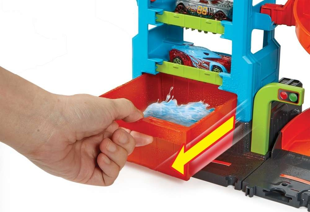 Zakręcona megamyjnia posiada 2 tory, które umożliwiają wjazd i zjazd z myjni. Wyposażona została w pojemniki na wodę; ciepłą i zimną, które pomogą w umyciu autek.