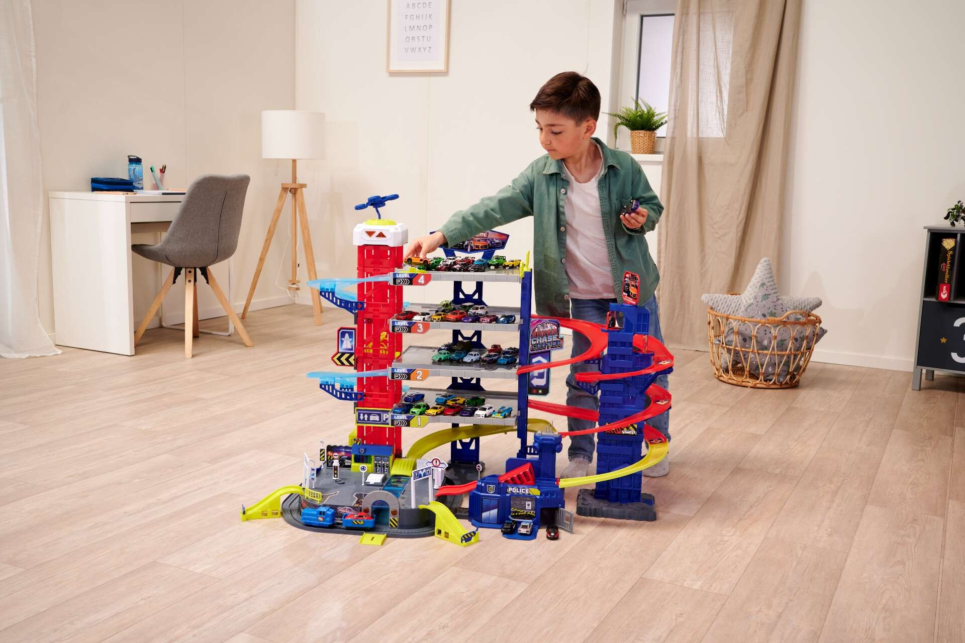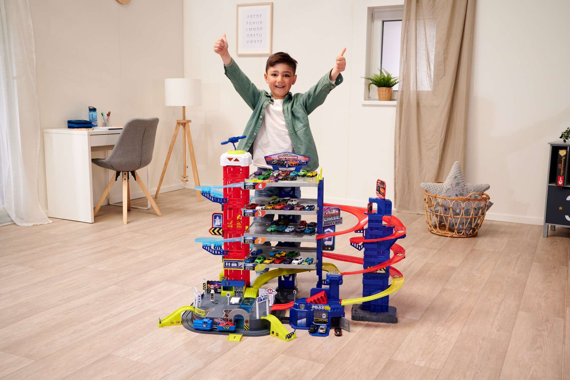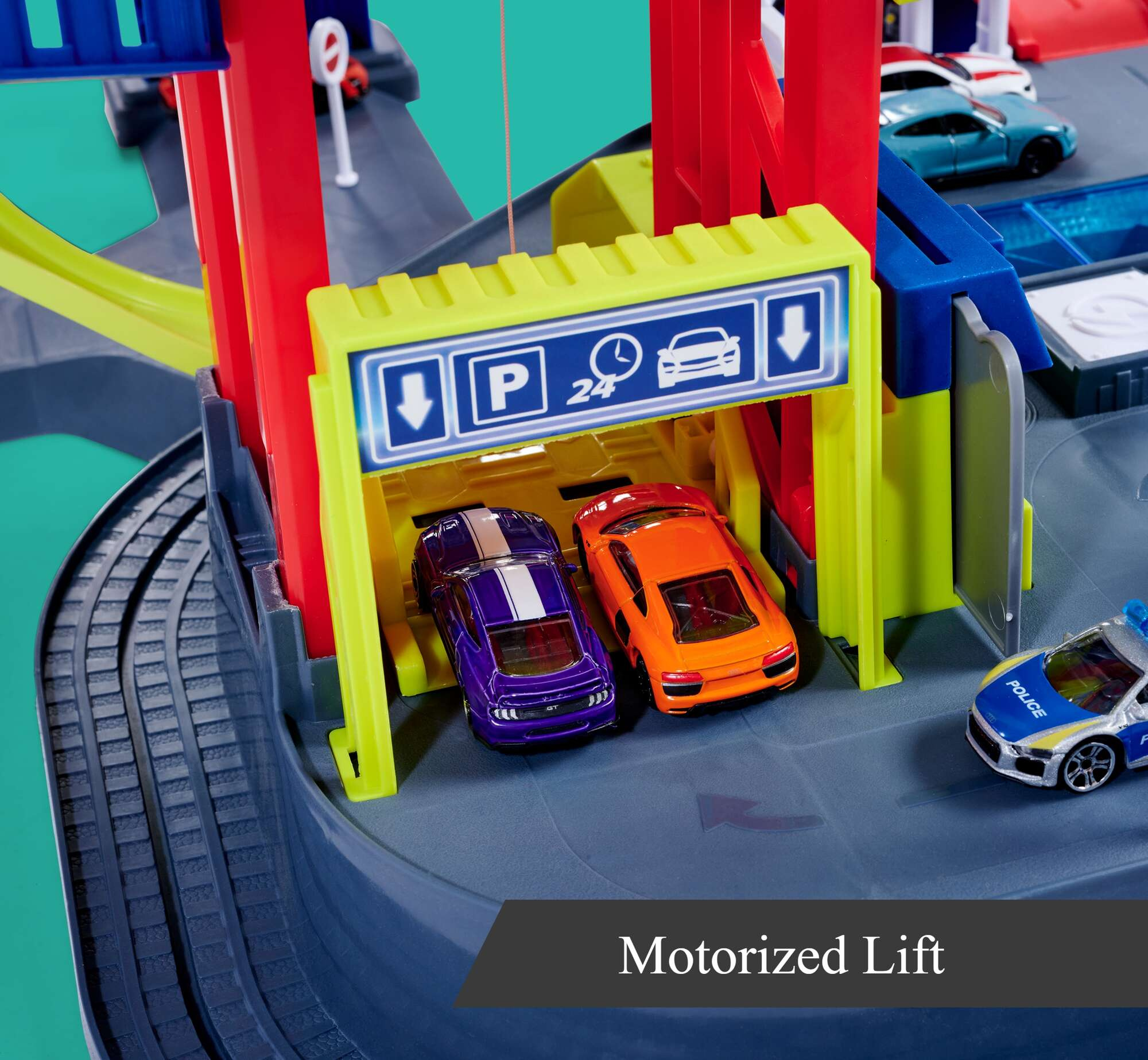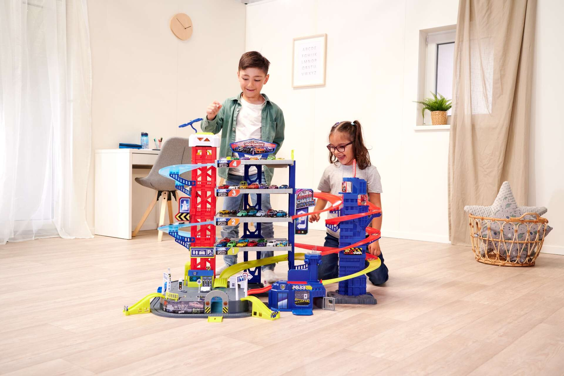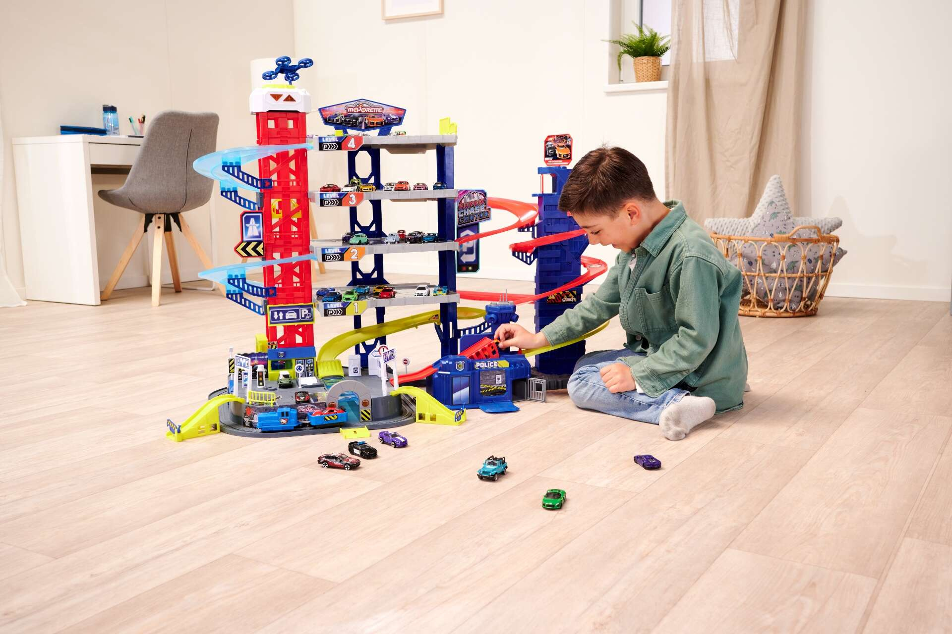 Zabawka ta to wspaniały zestaw składający się z kolorowego. 5-poziomowego garażu z torem oraz 4 autek typu resorak i pociągu. Garaż zawiera mnóstwo ciekawych funkcji, które zachęcają do pomysłowej zabawy, w tym posterunek policji z celą więzienną i zapadnią, a także policyjny dron do monitorowania otoczenia podczas dzikich pościgów. Zestaw zawiera również podwójny tor, obrotowe billboardy oraz liczne efekty świetlne i dźwiękowe. Na całym kolorowym parkingu umieszczone są różne naklejki, przyciągające wzrok najmłodszych.