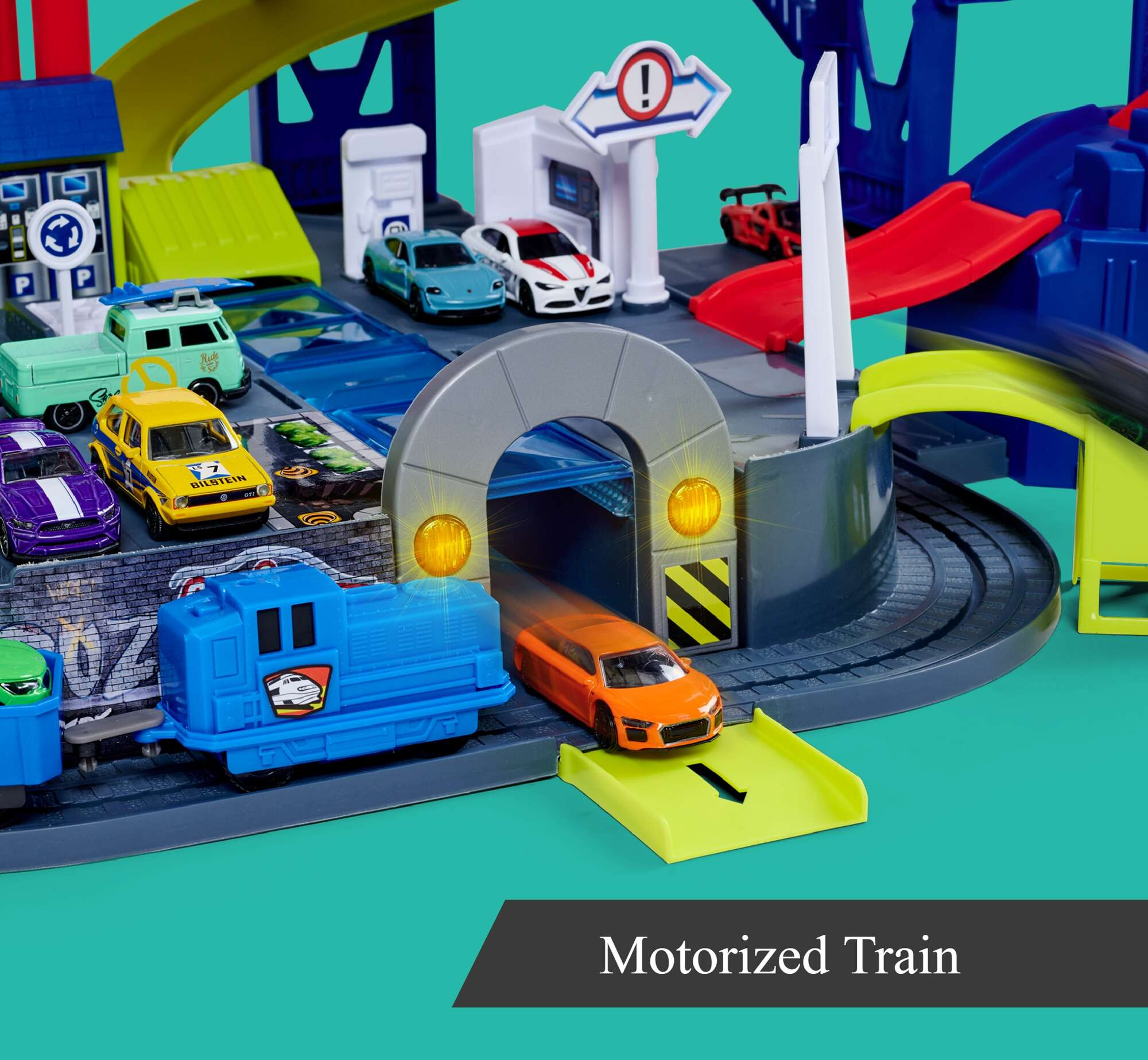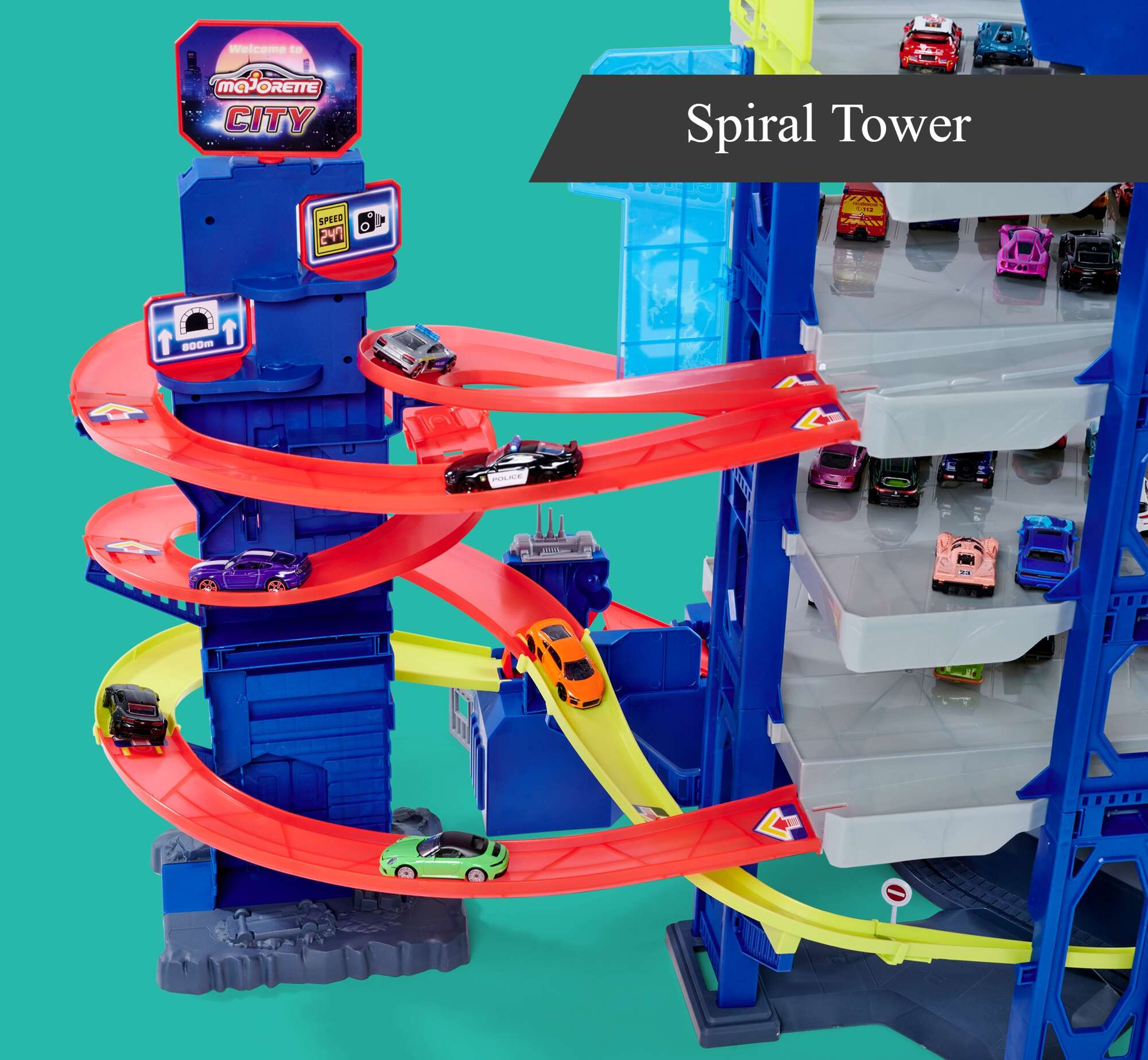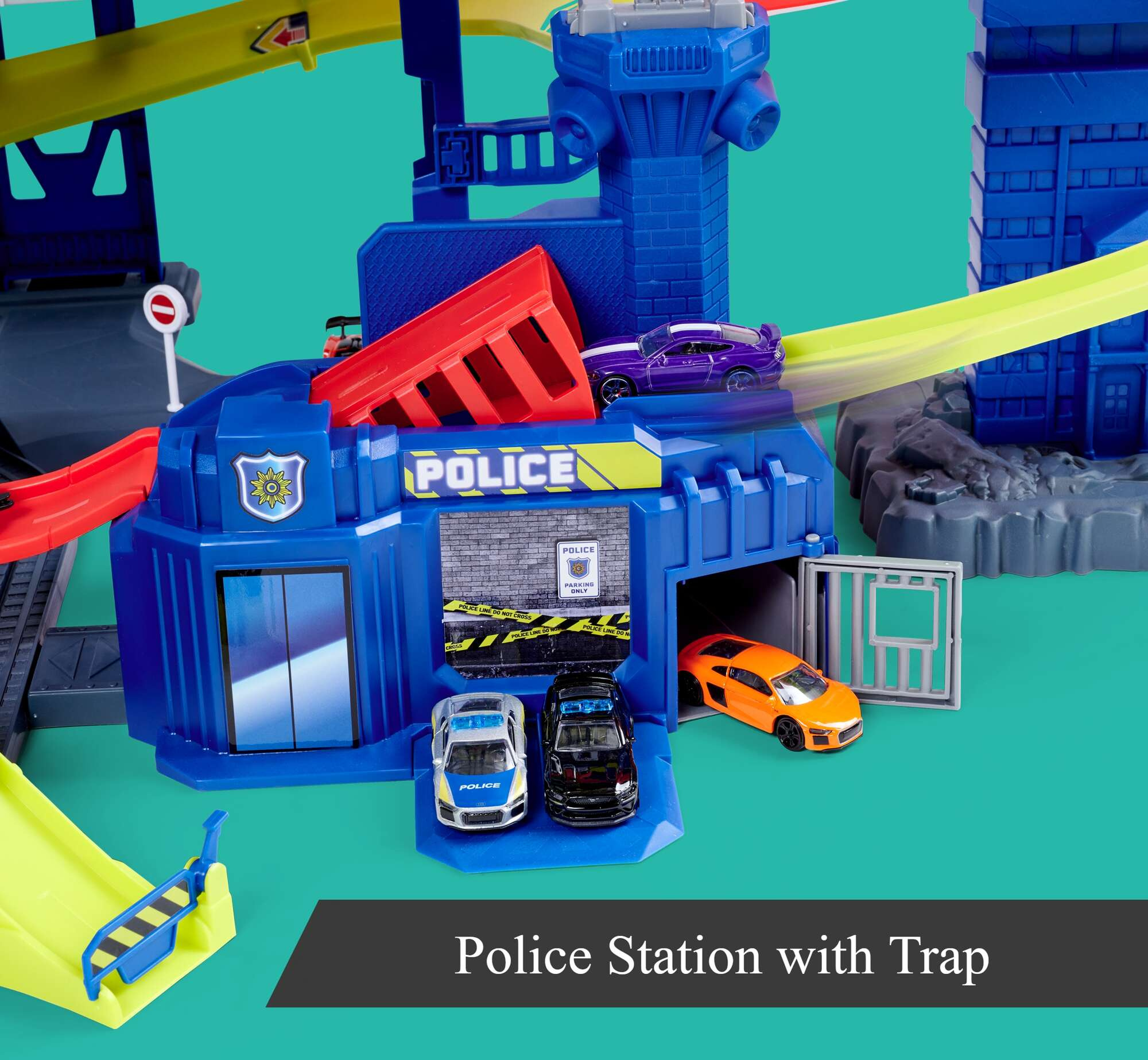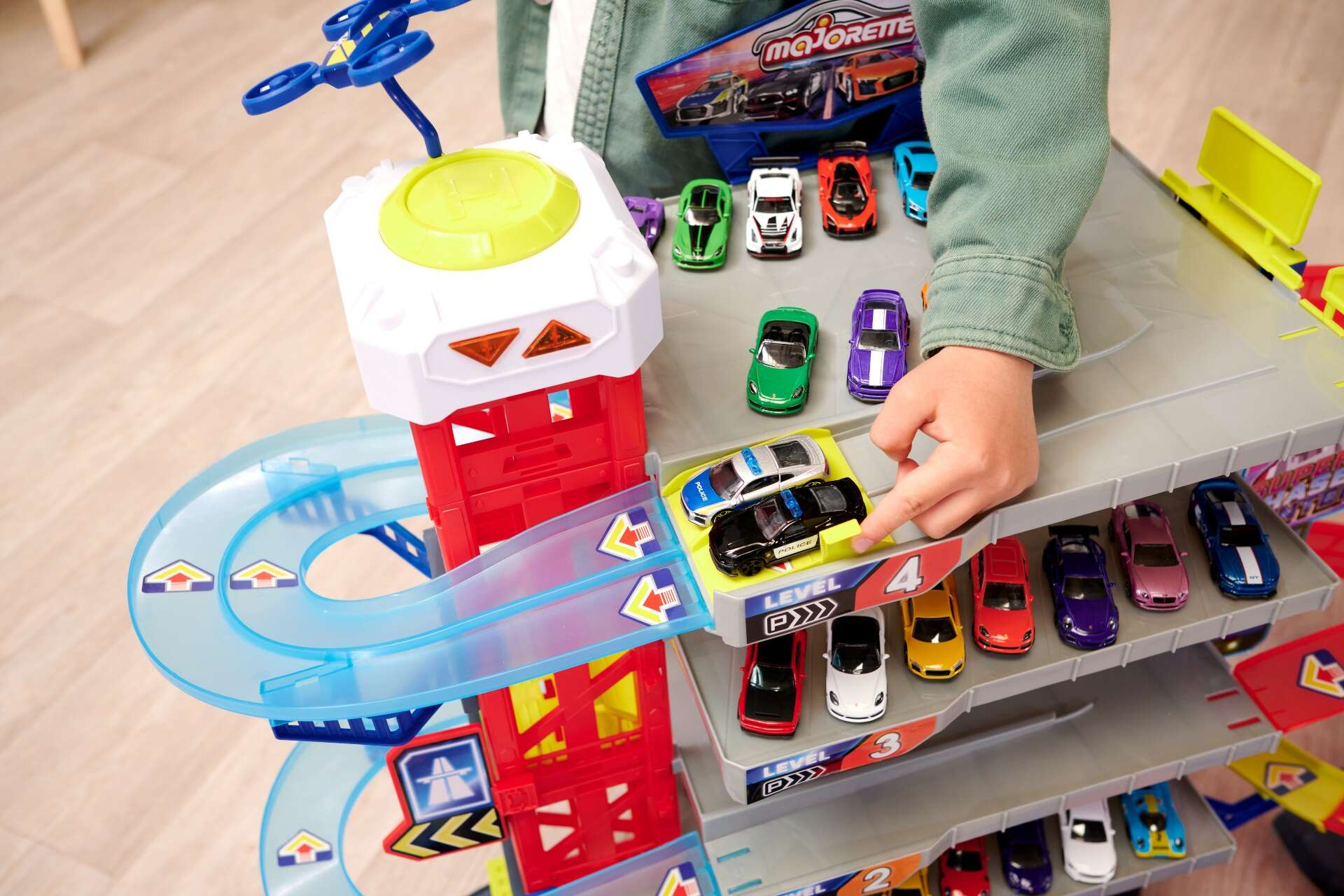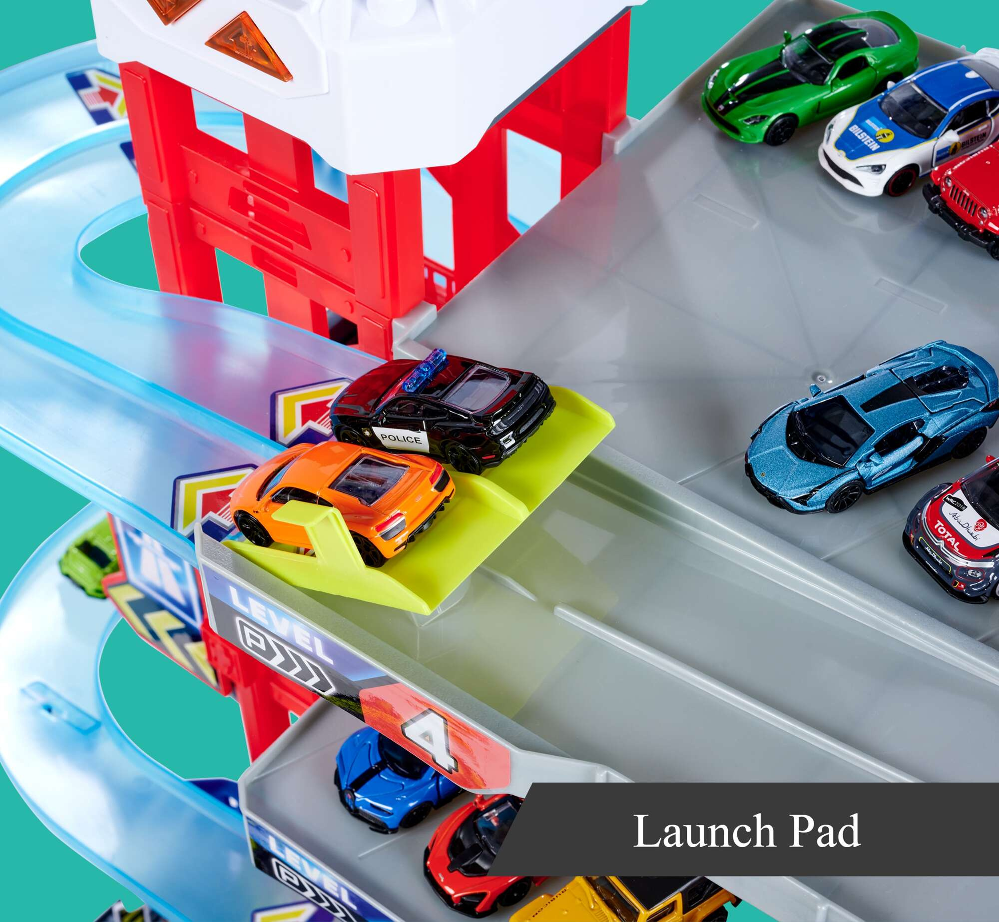 Zabawka ta to wspaniały zestaw składający się z kolorowego. 5-poziomowego garażu z torem oraz 4 autek typu resorak i pociągu. Garaż zawiera mnóstwo ciekawych funkcji, które zachęcają do pomysłowej zabawy, w tym posterunek policji z celą więzienną i zapadnią, a także policyjny dron do monitorowania otoczenia podczas dzikich pościgów. Zestaw zawiera również podwójny tor, obrotowe billboardy oraz liczne efekty świetlne i dźwiękowe. Na całym kolorowym parkingu umieszczone są różne naklejki, przyciągające wzrok najmłodszych.