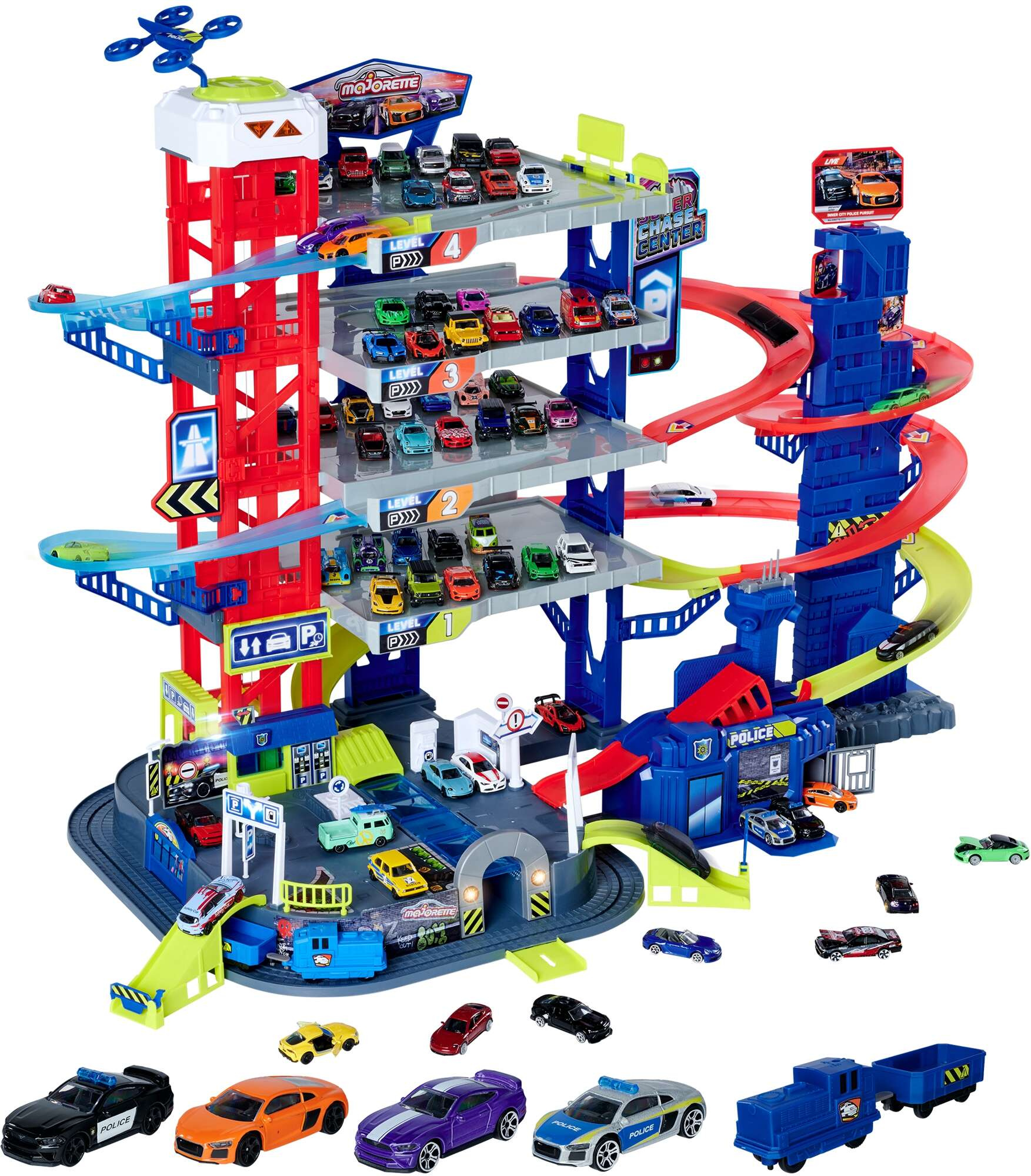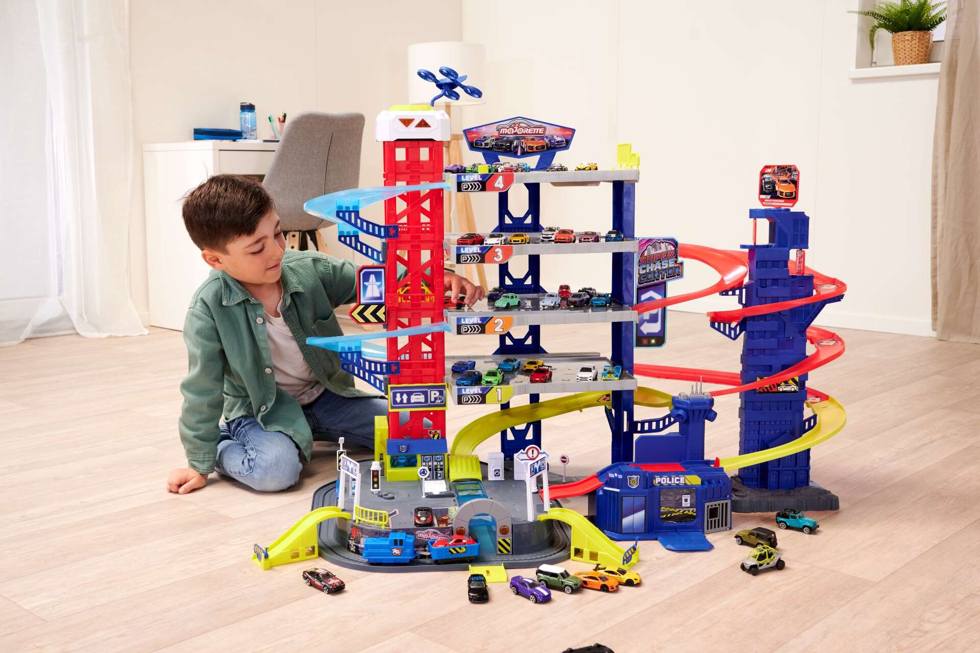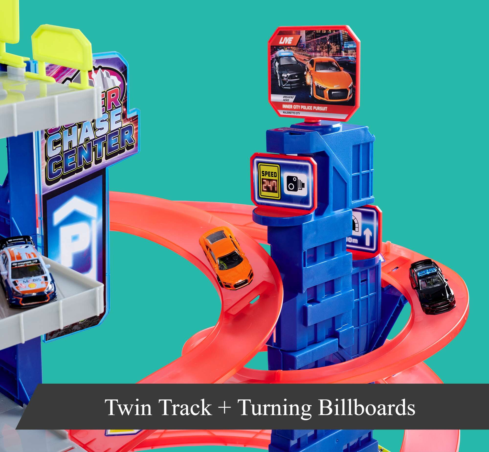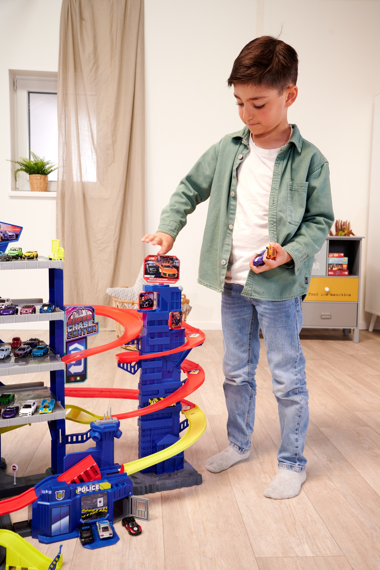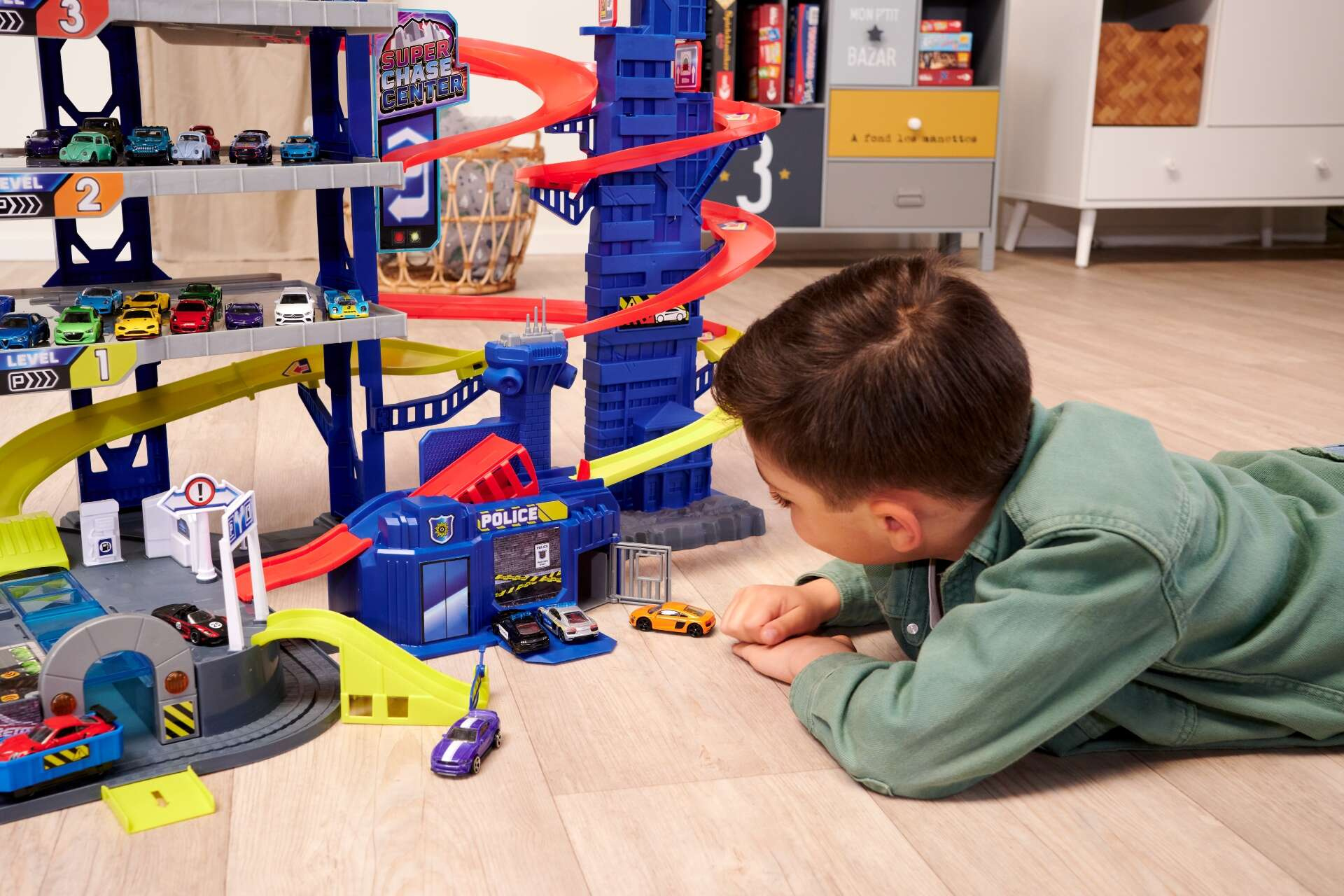 Super Centrum Pościgu zawiera 4 odlewane samochodziki z obracającymi się kołami: Audi R8 Coupé Police, Audi R8 Coupé, Ford Mustang GT Police i Ford Mustang GT. W składzie kompletu jest także pociąg na baterie z przyczepą, który może być używany przez policję do ważnych misji. Za pomocą windy autka mogą dostać się na wyższe poziomy parkingu, a potem zjechać w dół jedną ze spiralnych zjeżdżalni połączonych z drogą. Wraz z wysokością poszczególnych pięter, zjeżdżalnie zmieniają kolor. Od najwyższego poziomu wyróżniamy: błękitną, czerwoną oraz zieloną barwę.