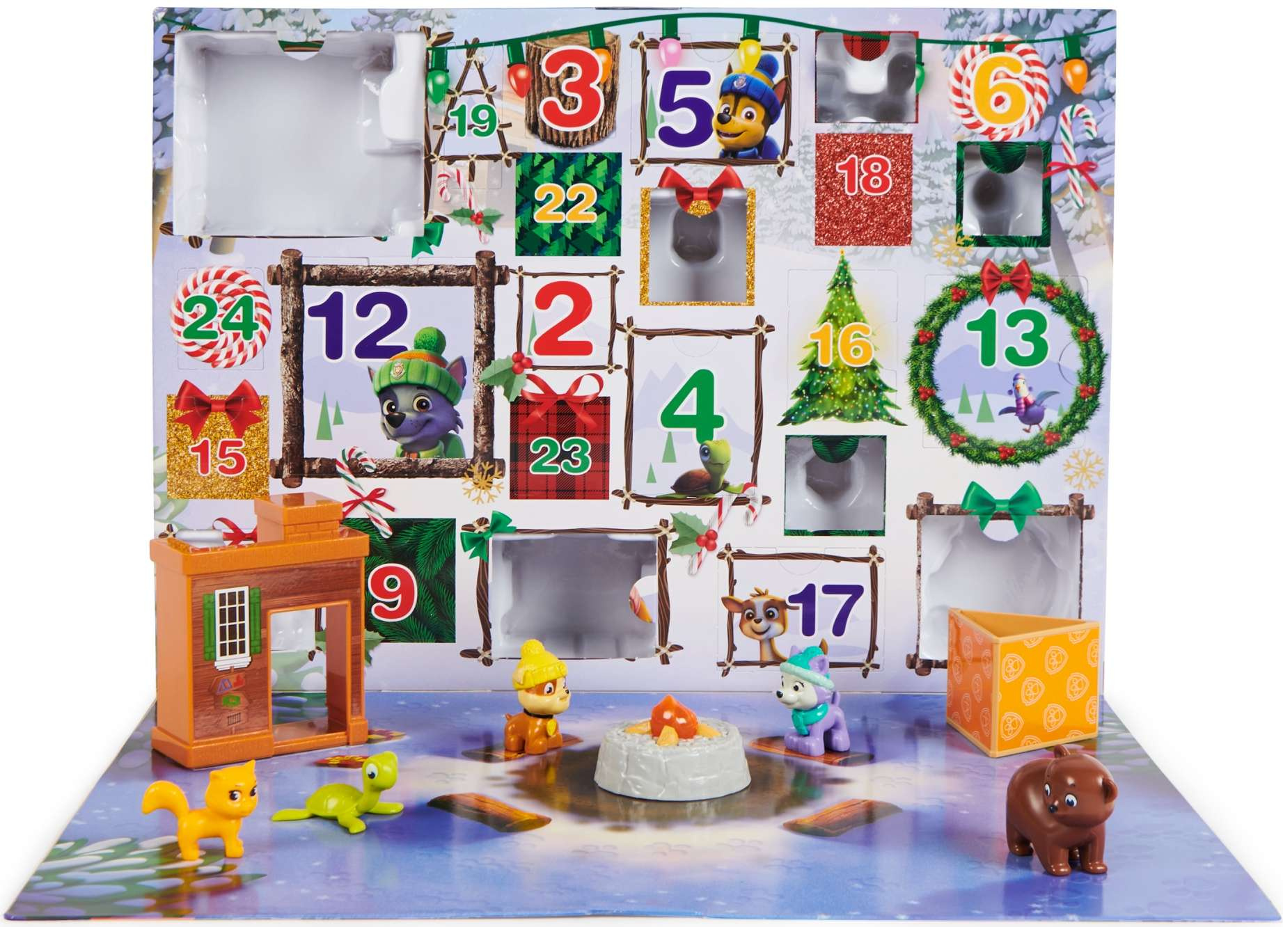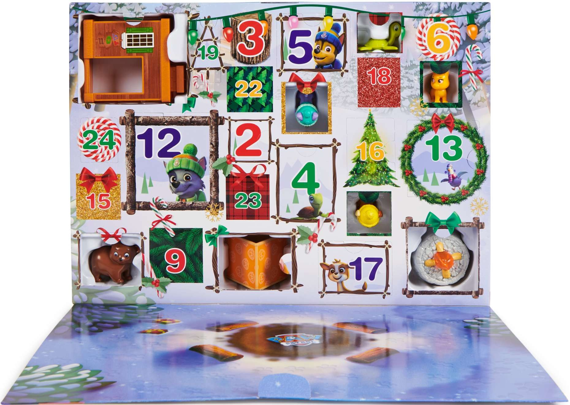 Kalendarz adwentowy dla dzieci zawierający figurki bohaterów z Psiego Patrolu i zimowe akcesoria do figurek. Zabawka ma postać klasycznego kalendarza adwentowego ze skrytkami. Prostokątne opakowanie ozdobione jest uroczą grafiką przedstawiającą szczeniaki wesoło baraszkujące w zimowej scenerii. Po otwarciu pokrywy ukazują się 24 ponumerowane skrytki, w których znajdują się 24 niespodzianki. Są to: