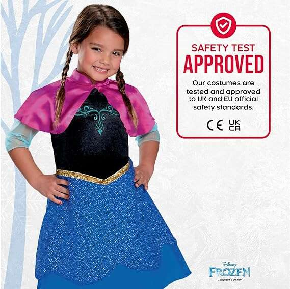 Strój karnawałowy jest idealny dla małych dziewczynek, a zwłaszcza dla wielbicielek kultowej bajki o dwóch siostrzyczkach, dobrze wykonany, odwzorowany na podobieństwo sukni bohaterki Anny z bajki Kraina Lodu w odcieniach błękitu i atłasowej czerni. Uszyty jest z lekkiego, błyszczącego i wygodnego materiału. Dodatkowo w zestawie znajduje się krótka różowa pelerynka.