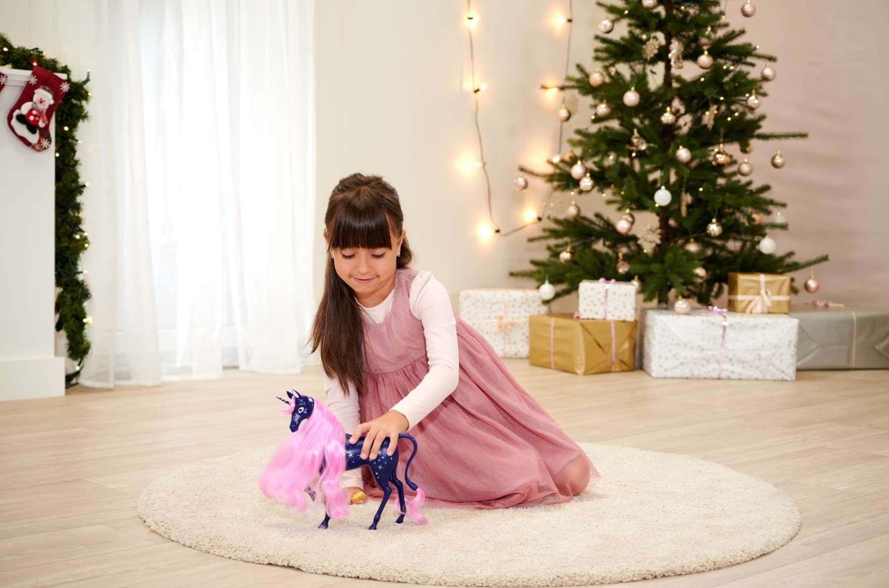 Figurka przedstawia magicznego Gwiezdnego Jednorożca z długą grzywą różowego blasku. Gwiezdny jednorożec jest wykonany z materiałów wysokiej jakości w ciemnoniebieskim kolorze i ma duże, różowo-lilowe oczy.