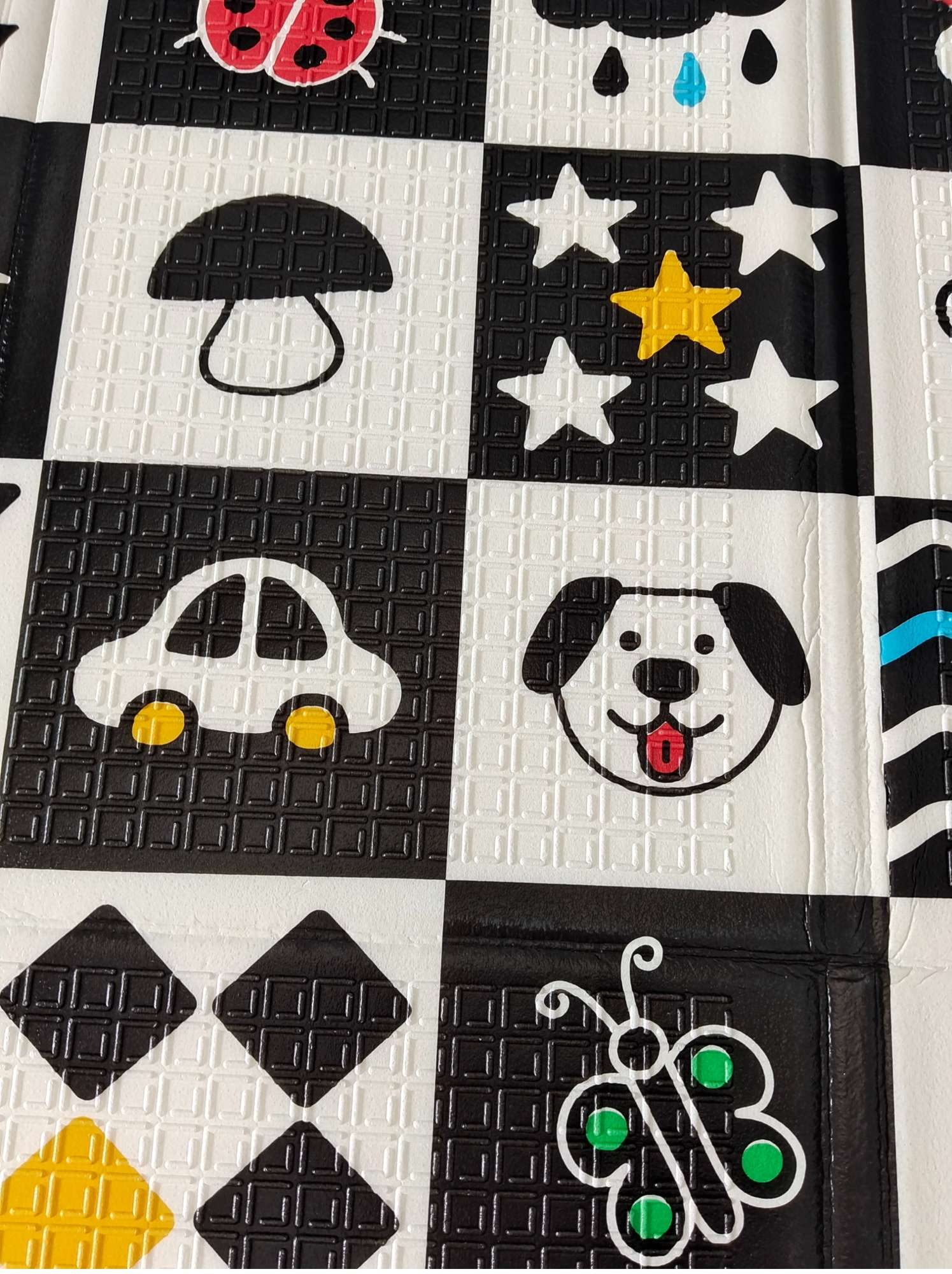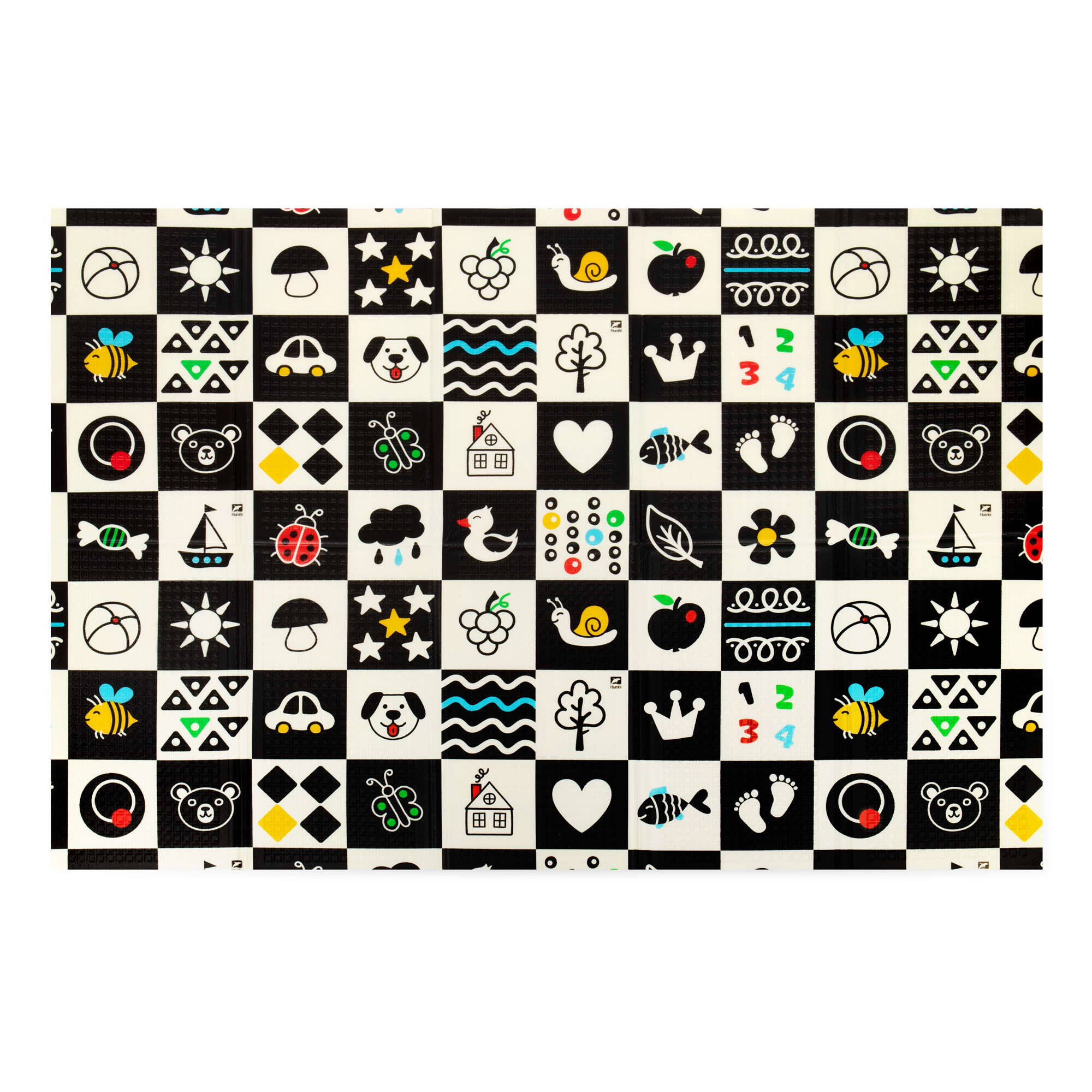 Na drugim boku widnieje wzór w czarno-białą kratkę z kontrastowymi obrazkami różnych zwierząt, przedmiotów oraz wzorów.