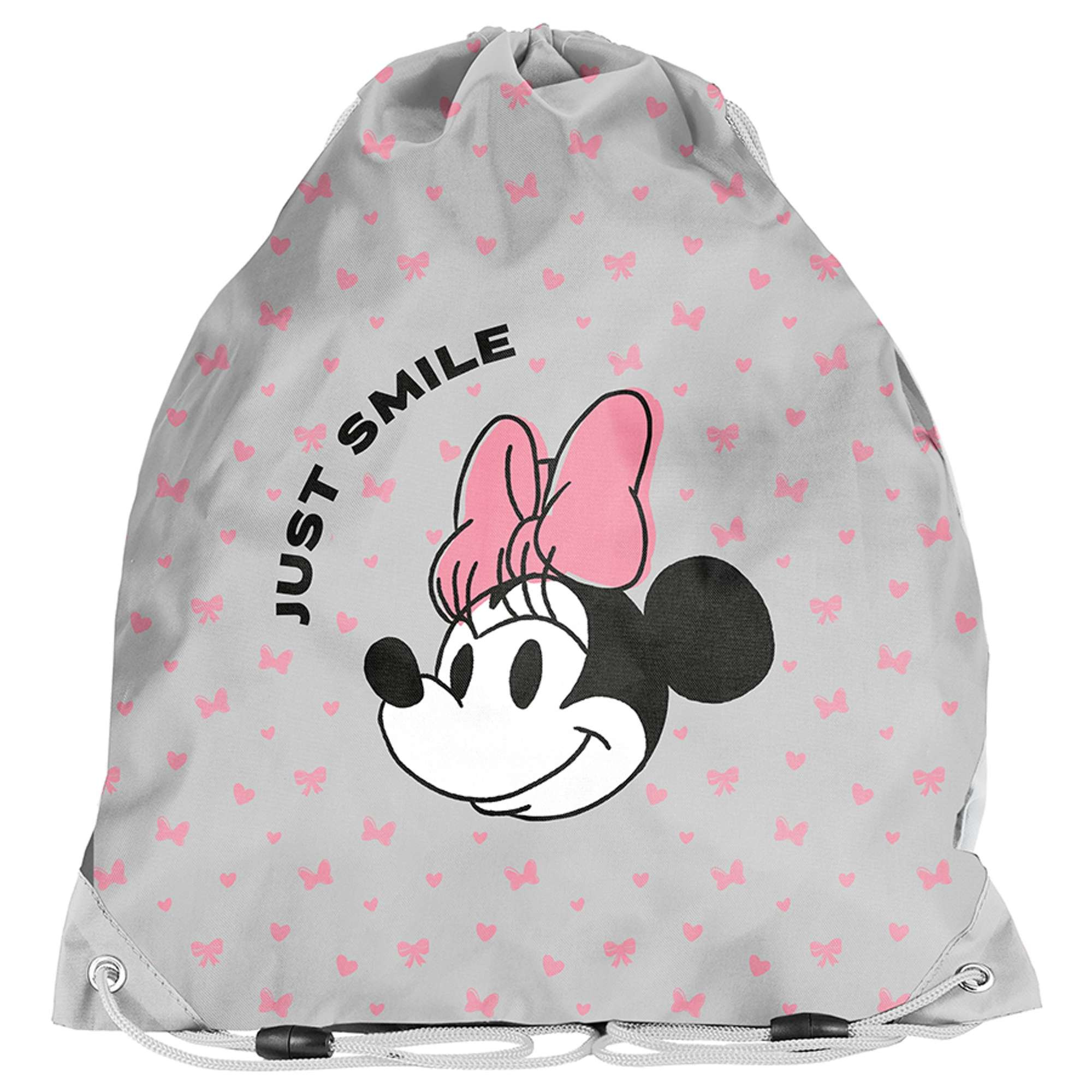 - Jest on w szarej kolorystyce i posiada obrazek z Myszką Minnie oraz napis "Just Smile". W tle znajdują się różowe serduszka, kokardki i motylki. Posiada dużą komorę i jest lekki.