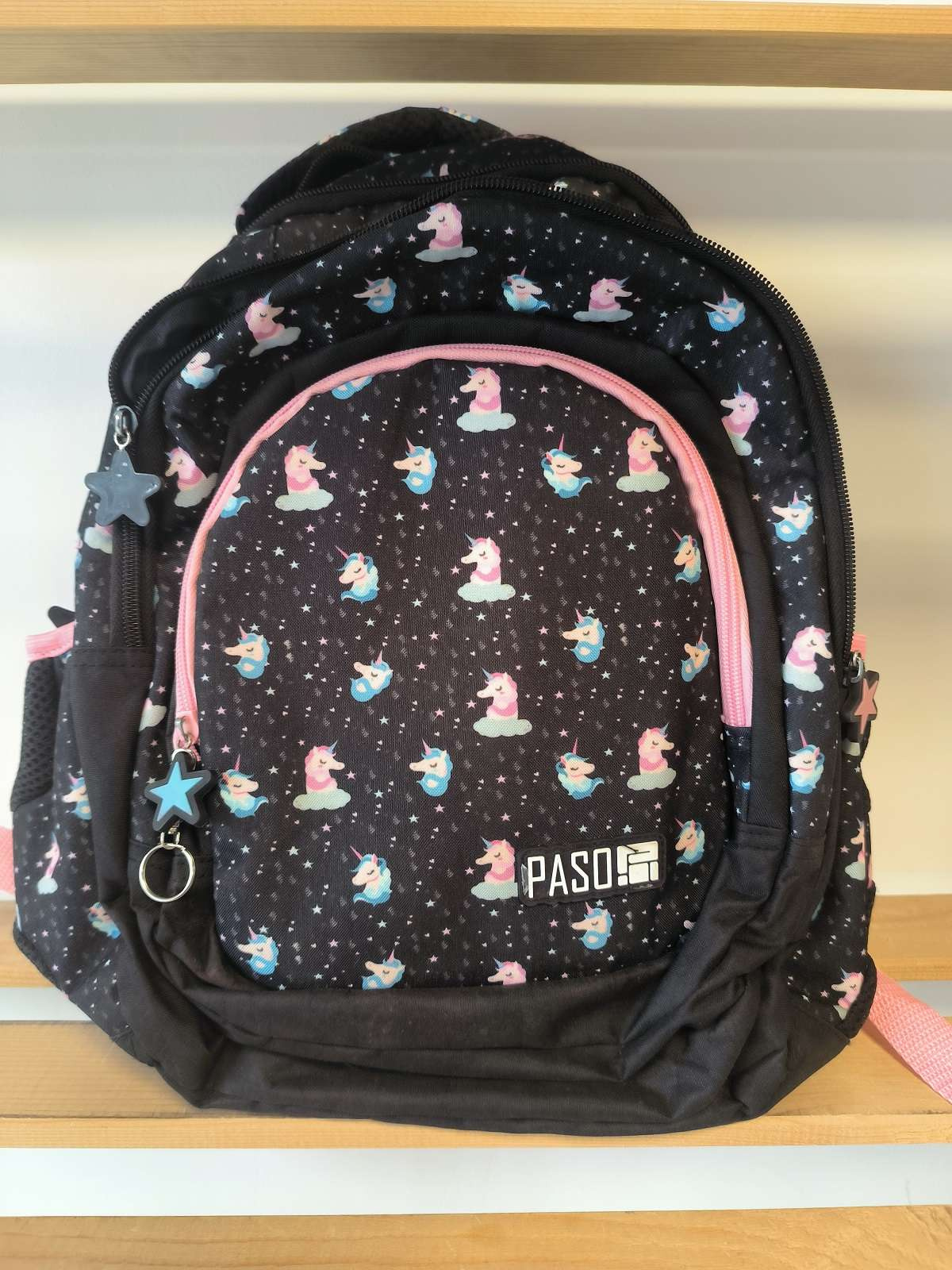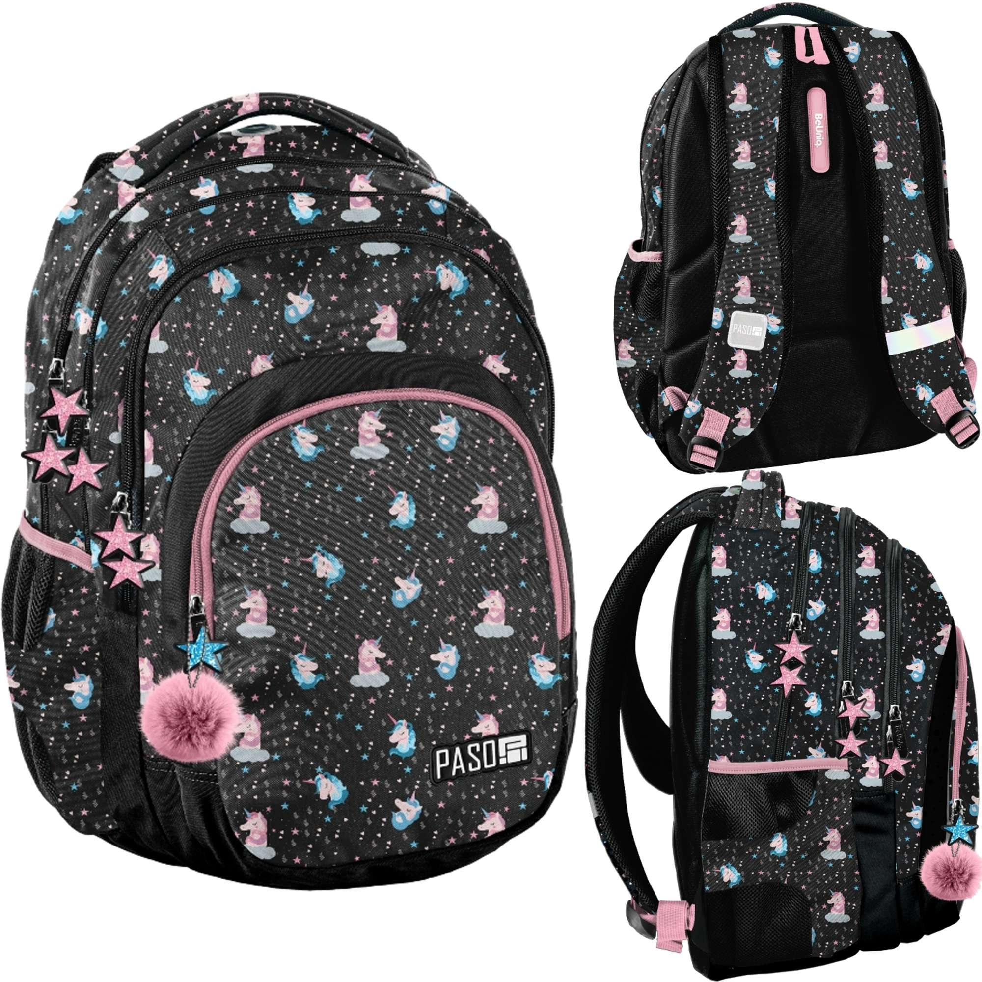 - Plecak jest w kolorystyce czarnej z różowymi elementami i posiada obrazki uroczych jednorożców. Został wykonany z najwyższej jakości materiałów. Jest lekki, ma usztywniane, profilowane plecy oraz wygodne, ergonomiczne szelki.
