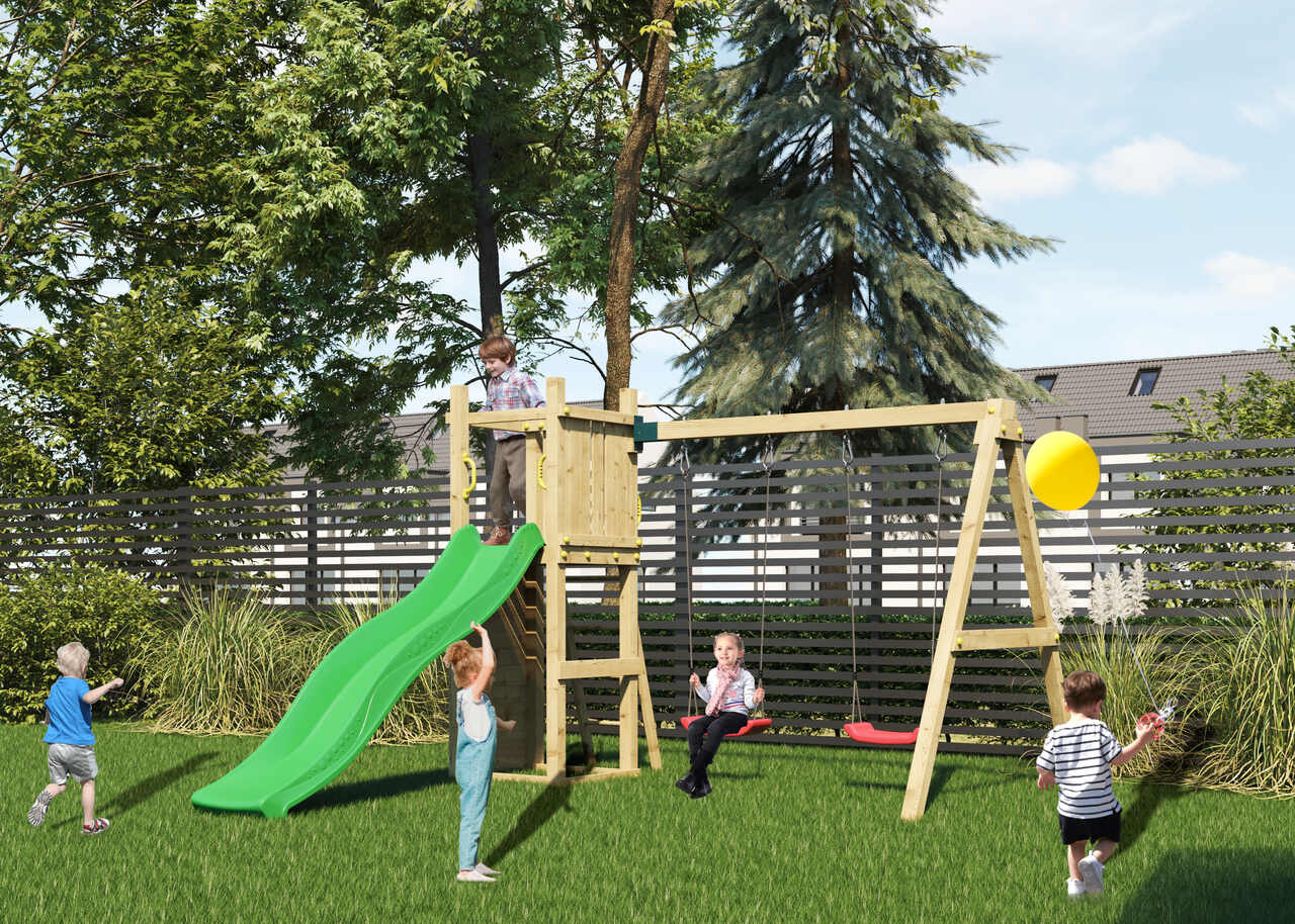 Podstawą placu zabaw jest drewniana konstrukcja, do której dołączyć można wiele akcesoriów.