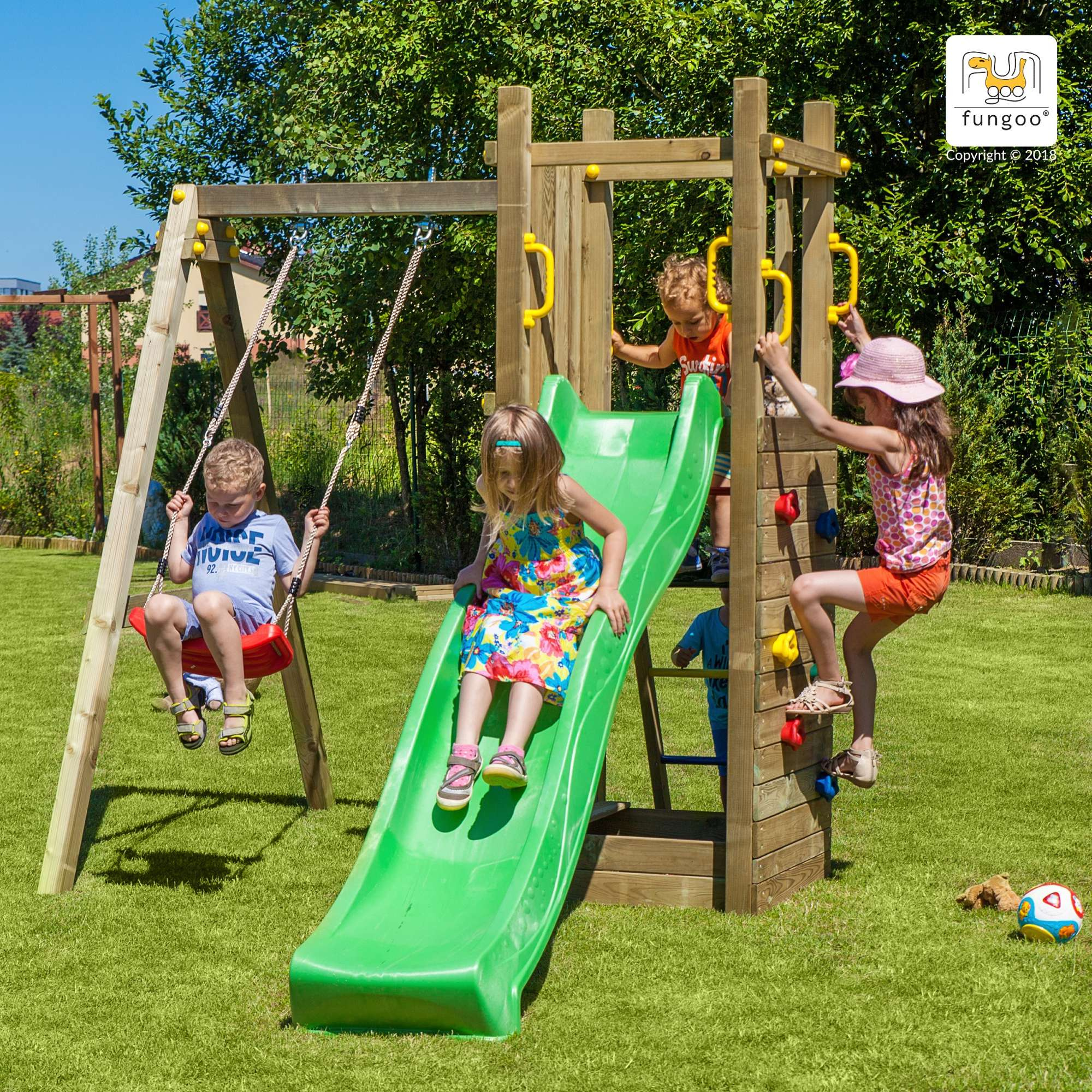 Drewniany plac zabaw został przygotowany przez markę Fungoo, specjalizującą się w ogrodowych zestawach do zabawy na świeżym powietrzu.