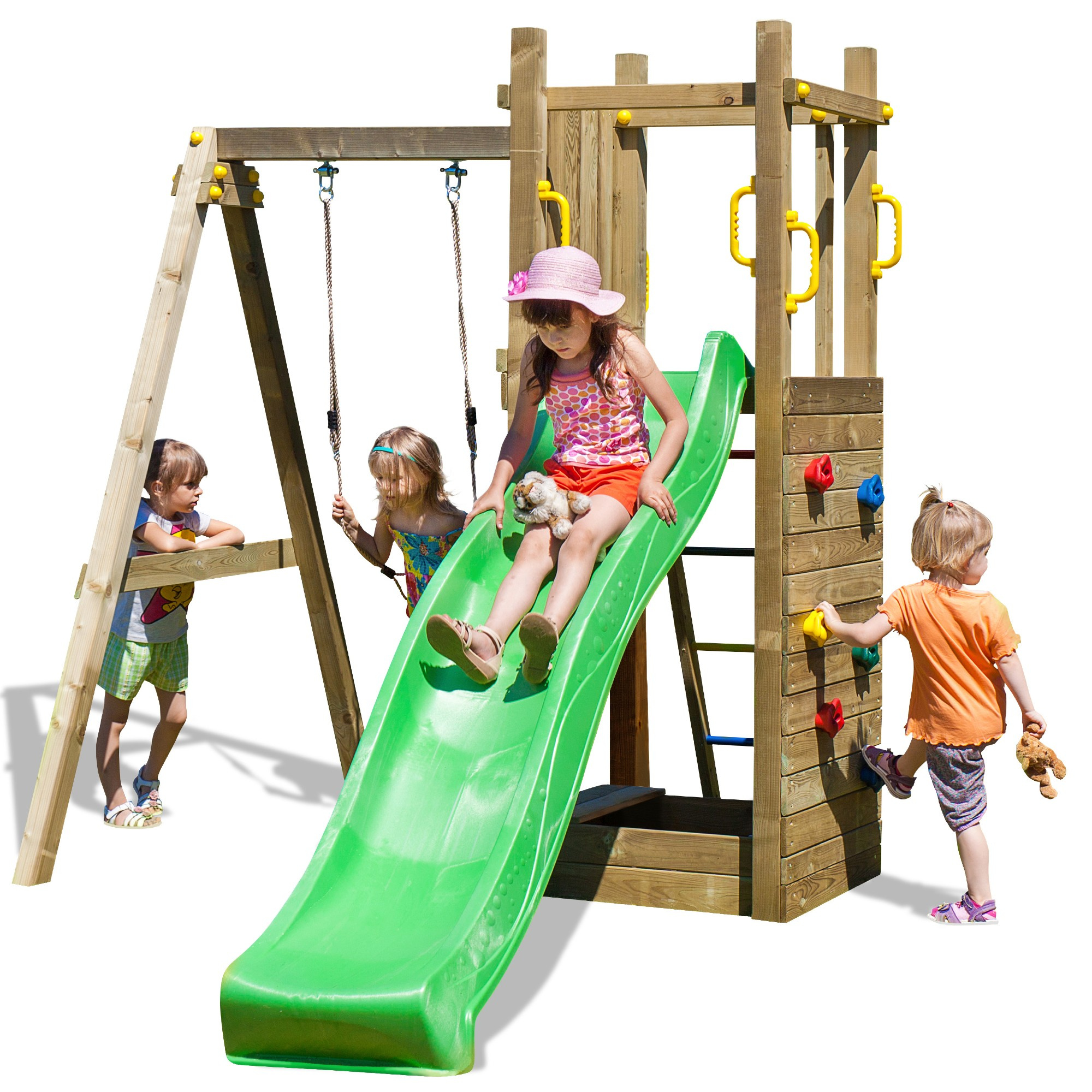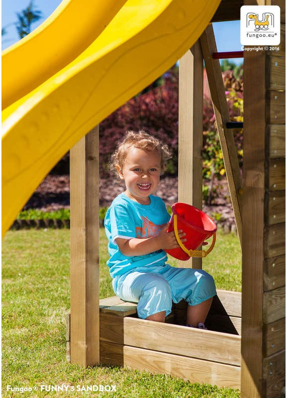 Plac zabaw FUNNY3 składa się z drewnianej platformy, huśtawki, zjeżdżalni, ścianki do wspinaczki i piaskownicy, co daje dzieciom wiele możliwości do zabawy na świeżym powietrzu.