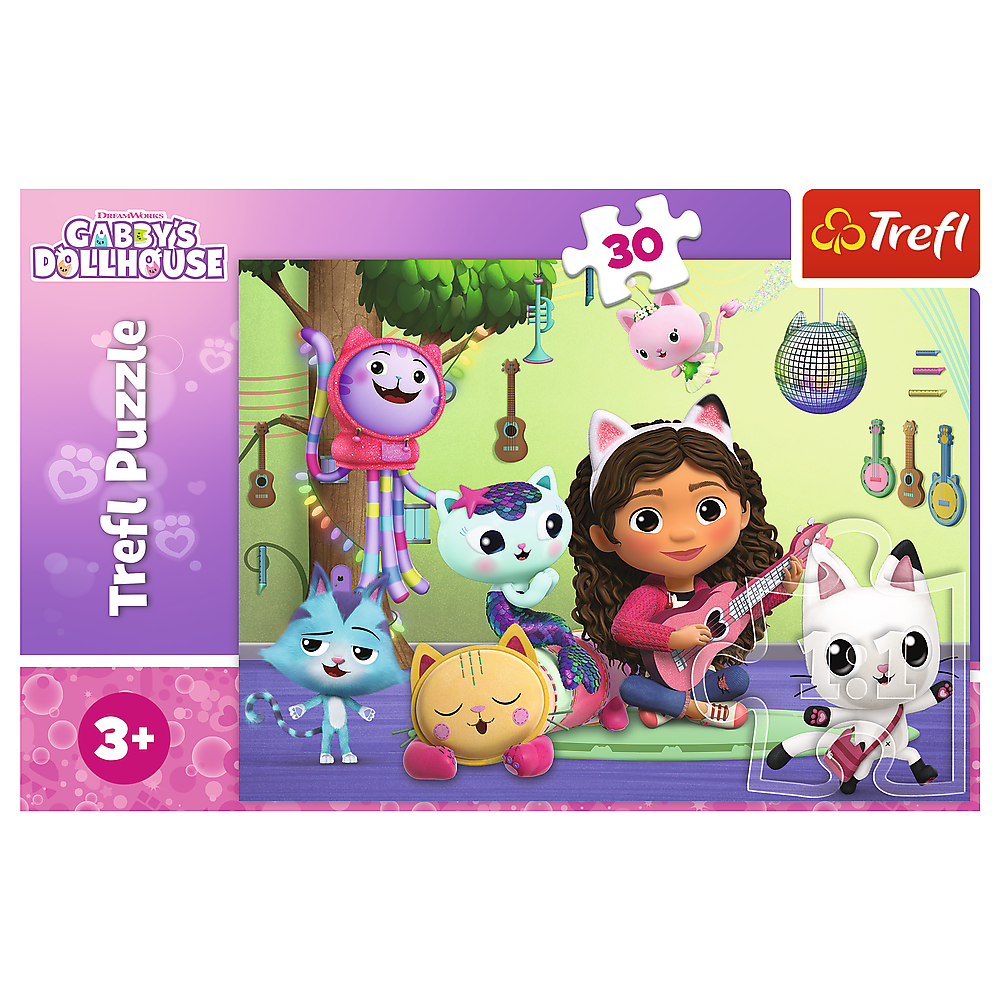 - Puzzle Koci Domek Gabi składają się z 30 elementów o wymiarach 27 x 20 cm i umożliwiają ułożenie obrazka, przedstawiającego Gabi grającą na gitarze siedzącą wraz z kotkami.