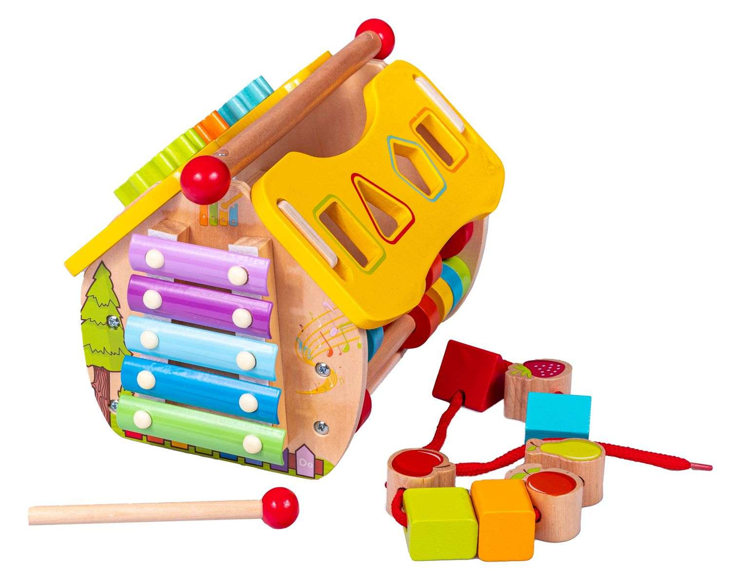 - Drewniany domek aktywizujący z liczydłem, zegarem, cymbałkami, nauką kształtów.