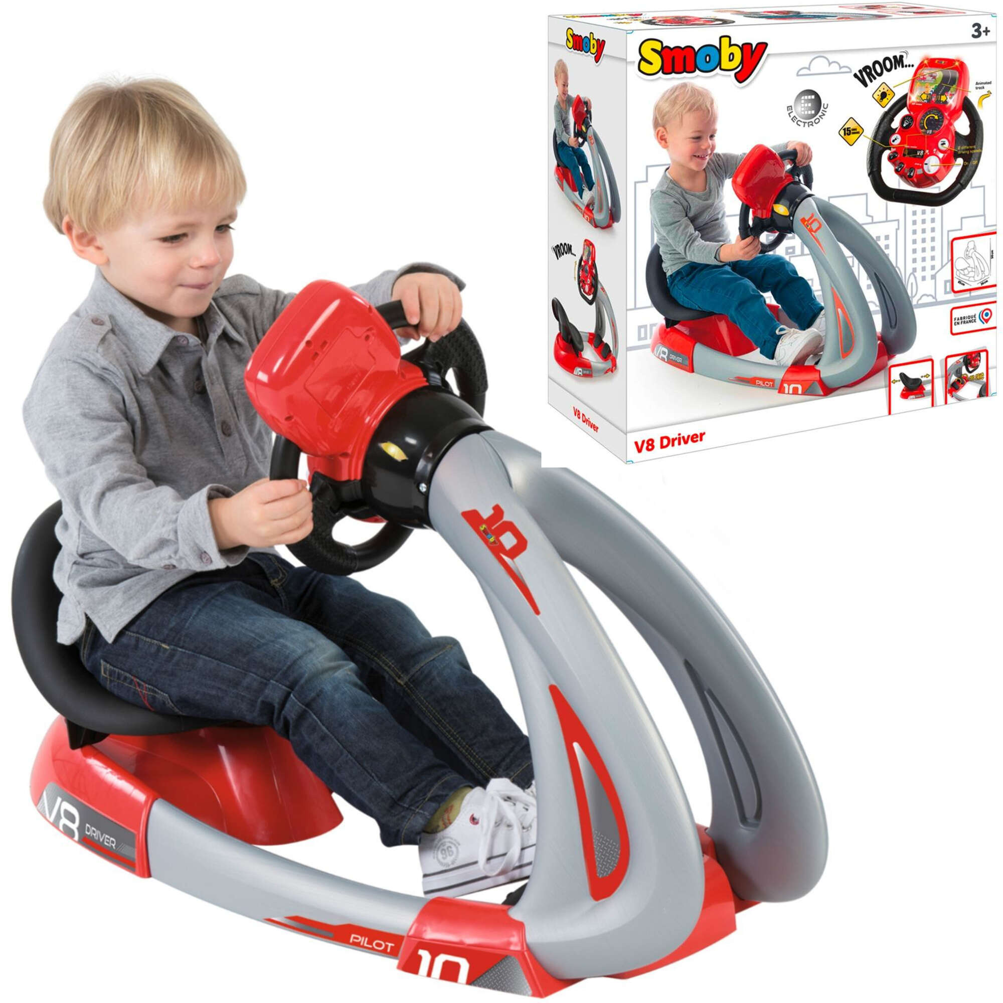 Symulator V8 DRIVER jest w kolorze czerwono-czarnym, a składa się z solidnej i stabilnej ramy z ruchomymi pedałami, wygodnego siedziska i ruchomej kierownicy z ekranem, na którym wyświetlana jest trasa do pokonania. Nad ekranem znajdują się dwie podświetlane strzałki, które pełnią funkcję kierunkowskazów. Odległość siodełka od kierownicy można regulować, dzięki czemu zabawka ta rośnie wraz z dzieckiem.