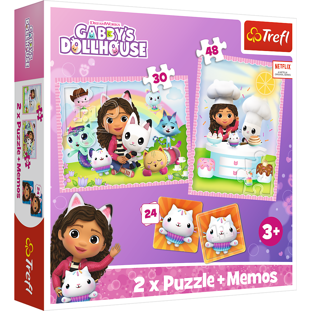 Zestaw Koci Domek Gabi składa się z 2 układanek: 30 elementów i 48 elementów oraz gry pamięciowej memory. Na obrazkach znajduje się tytułowa bohaterka raz jej przyjaciele. Wymiary obu obrazków to: 27,5 x 20,5 cm. Gra memory składa się z 24 kafelków z podobiznami bohaterów bajki.